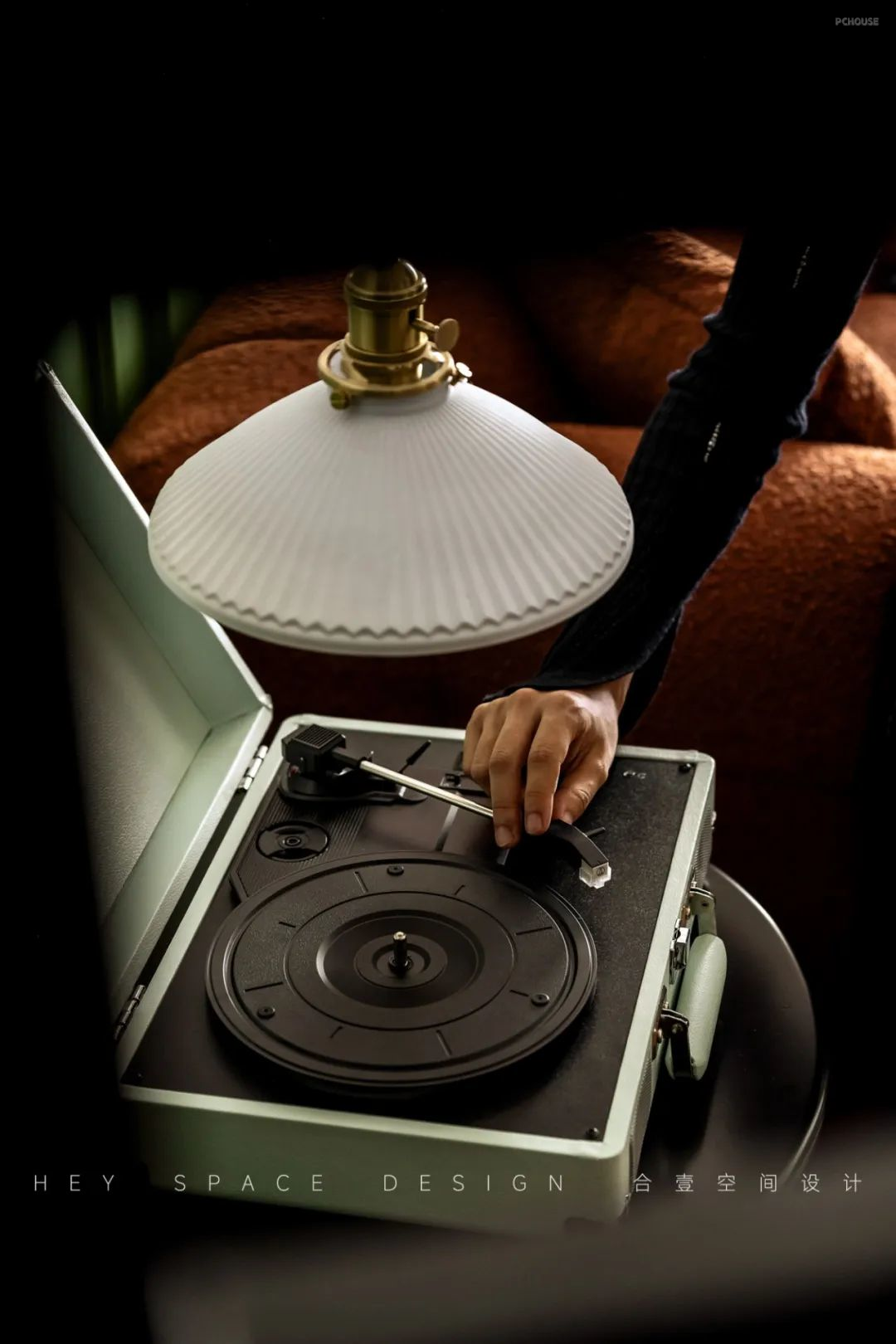 @合壹空间设计:休闲的地台区,搭配一把藤编木质单椅更显慵懒,闲暇时,或躺或倚,一杯小酒独酌,伴着唱片机播放的曲调,满是浪漫的格调。