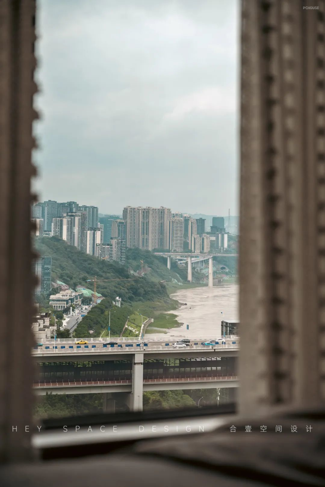 @合壹空间设计:主卧拉开窗帘,便能欣赏到窗外江景的治愈美好,室外开阔而生动,室内温馨而舒适,看车水马龙,灯火人间。