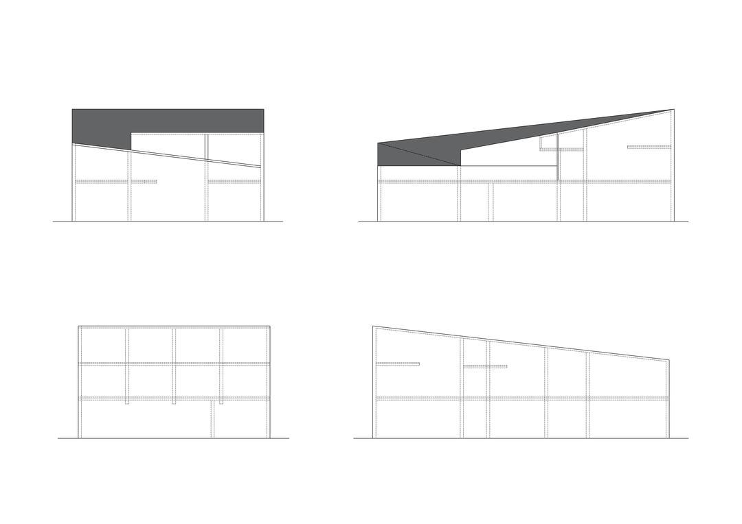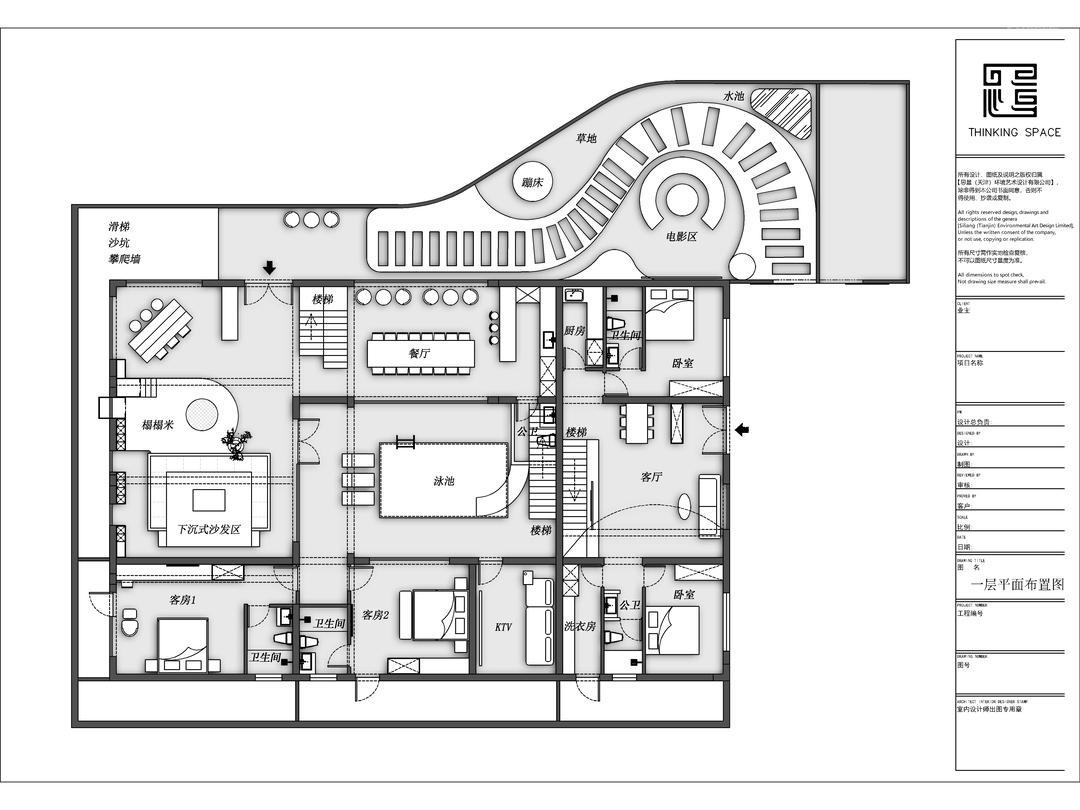 平面户型布局图:北侧是一层休闲空间加二层loft客房的设计。房屋建筑的北侧最高点达8米多高,南侧最低点只有3米高,这样就形成了围合式的破面屋顶的设计。