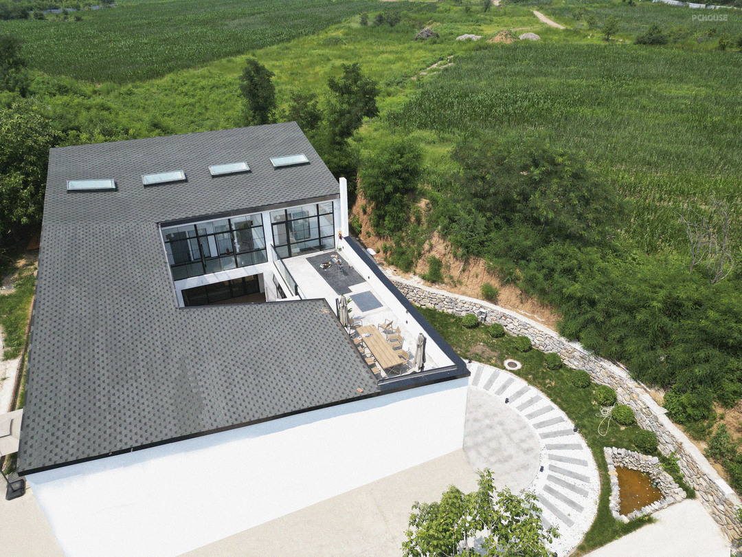 利用高度之差,形成不同的空间,南面一层餐厅加二层loft客房,东侧楼下影音室二楼loft客房,北侧高挑空的套房空间,西侧为单层休闲餐厅空间。一层至二层的顶面落差之处设计成露台户外空间。让建筑因旋转式的坡面屋顶高度形态而有了层次变化之美。