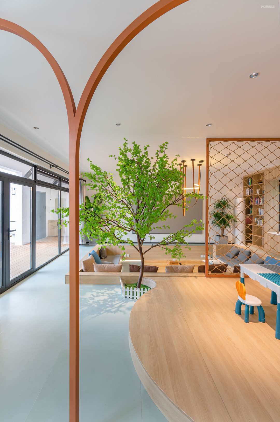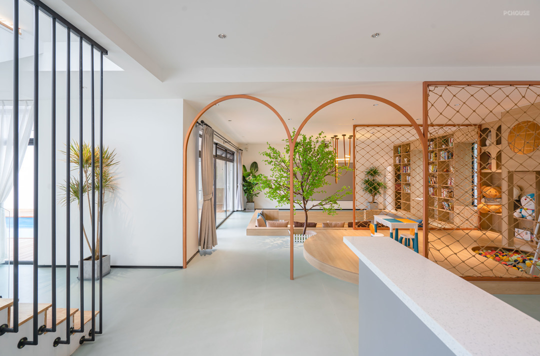 设计的拱形门洞,是金属烤漆材质的,作为儿童区与休闲空间的分隔。拱形元素也增加了空间的趣味性!