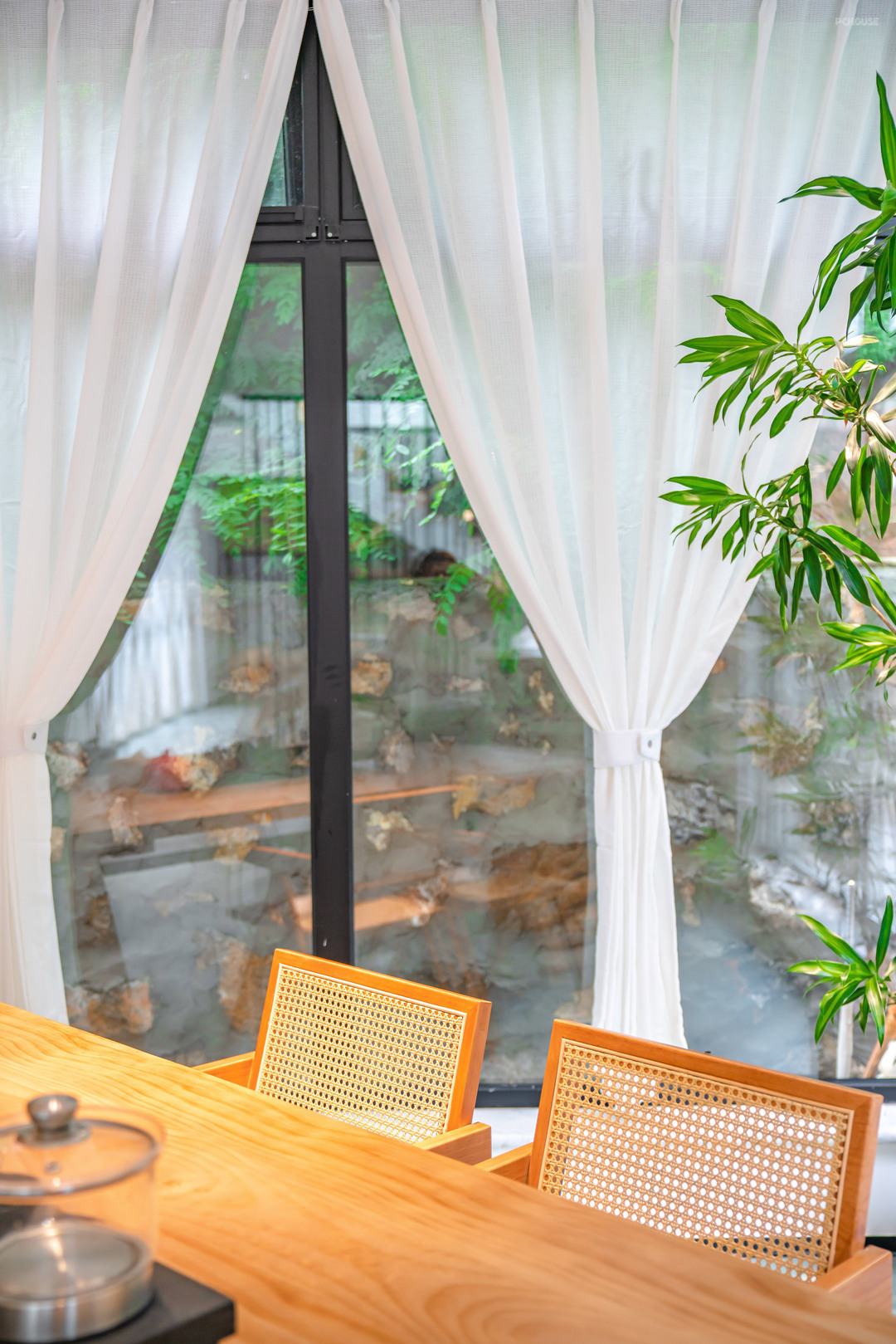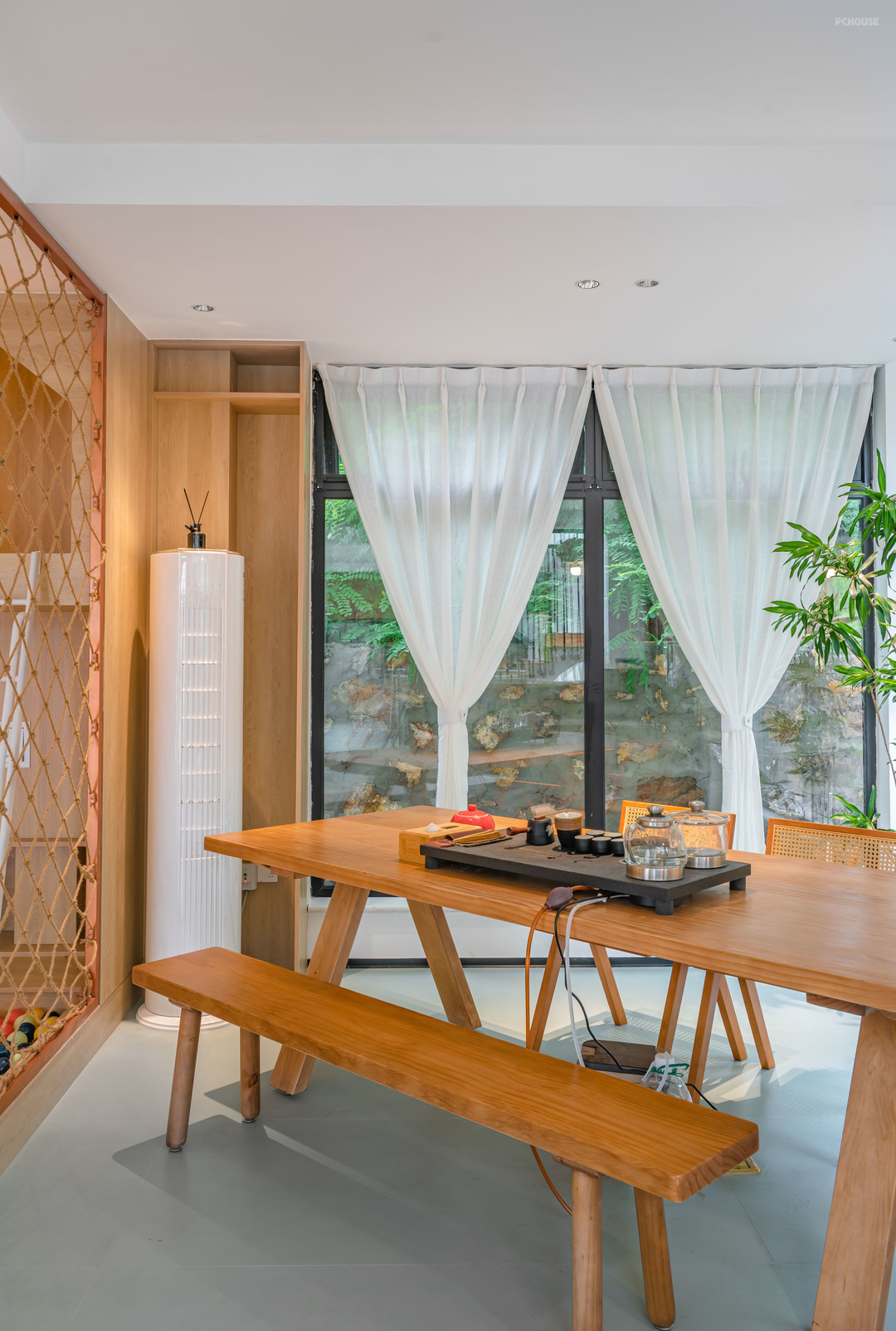 餐厅是自助式的,配置了冰箱开放式厨房等。民宿的客人都可以自助做饭炒菜来使用。两面通透的落地玻璃,使空间通透性非常强。水泥质感的吊灯,简朴自然,与整体空间相融合。
