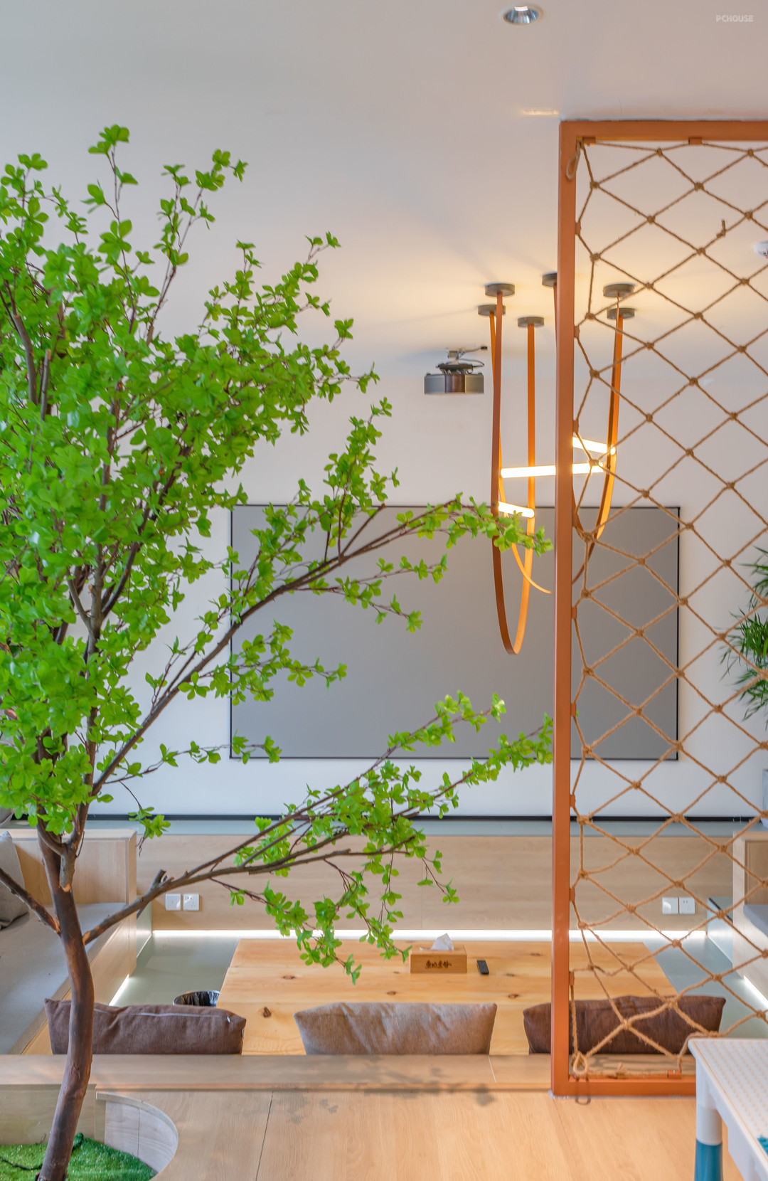 民宿设置了茶室-儿童娱乐空间-下沉式沙发-图书阅读区,将空间合理规划,丰富空间属性。 入口处线性拱门的设计,营造出曲径通幽之美感,辅之榻榻米的设计以及吊灯设计的加持,将点线面三者充分的融合在一起,空间的艺术感,层次感,灵动感大大提升。利用圆弧金属网格围合出亲子娱乐空间,增加空间功能性。