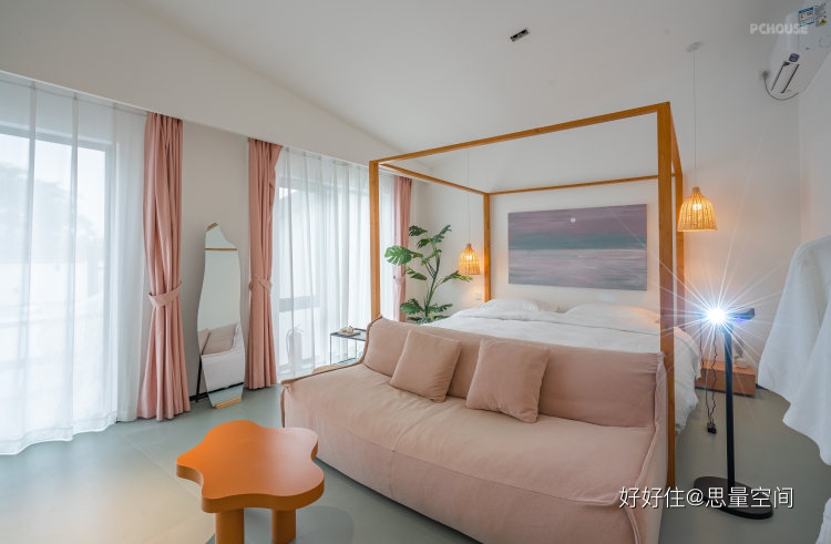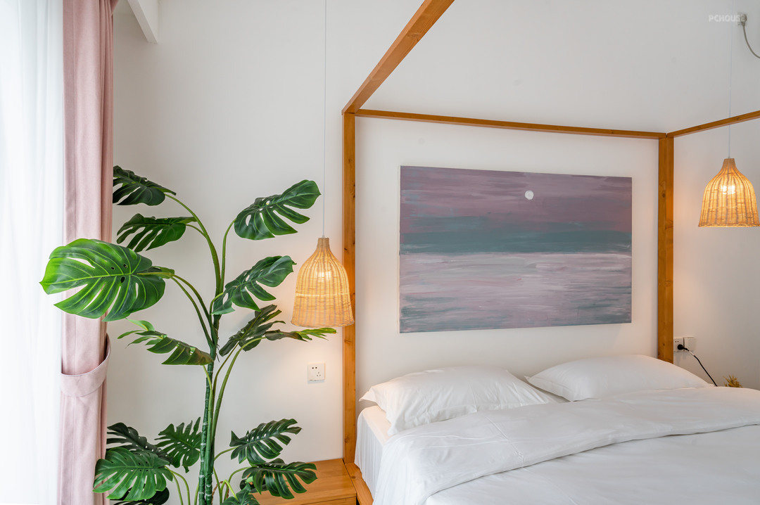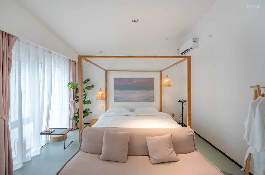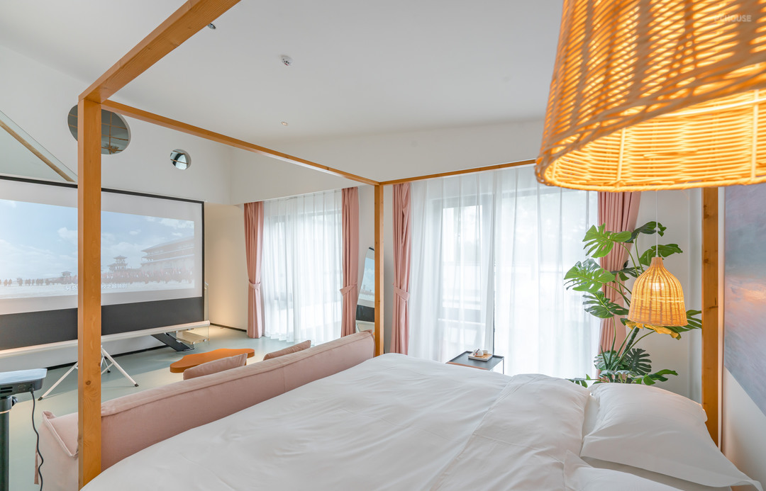 框架床真的很有艺术感。落地式的投影幕布,可以在夜晚的时候播放电影。床头背后挂的是设计师手绘的挂画