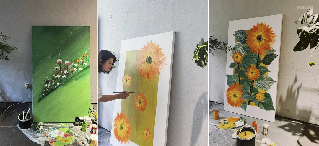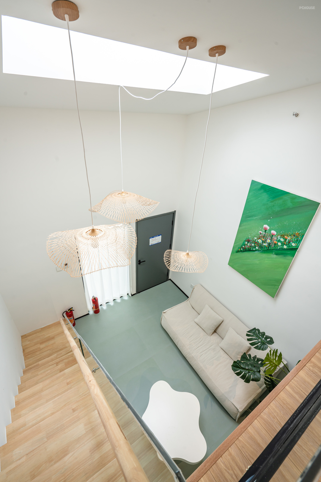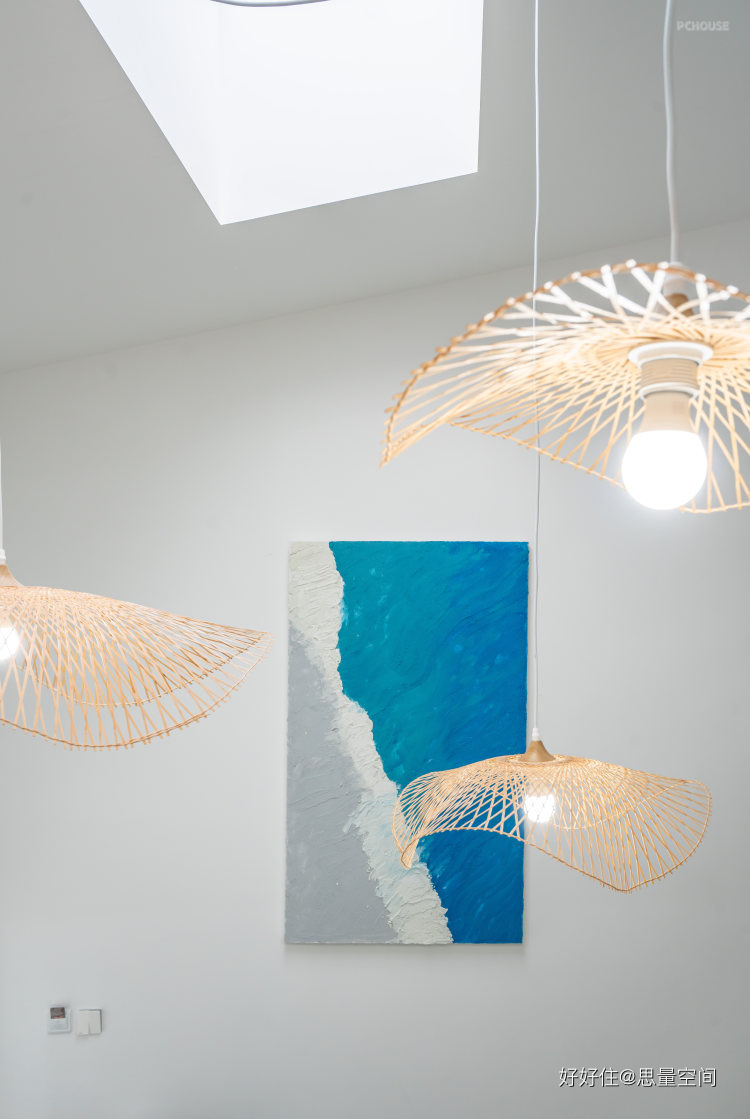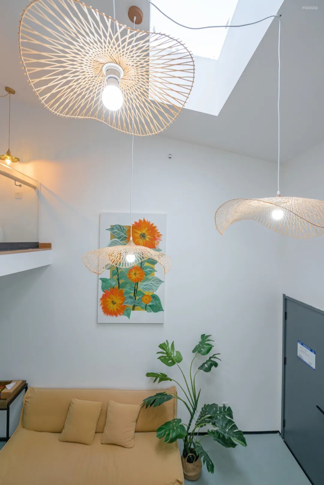 在做loft设计的时候,顶面的坡面顶开了天窗,作为采光使用。阳光在午后倾泻而下,空间里采光就非常充足。墙面挂的是设计师亲自手绘的挂画,与沙发的颜色都是非常搭配的。