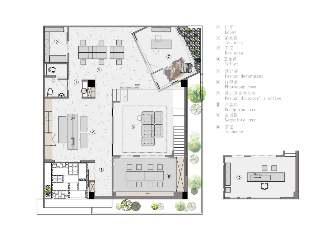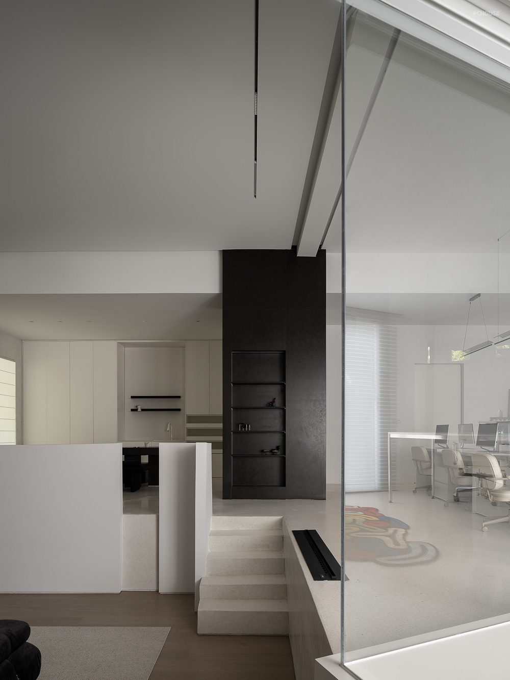 抬高平面的设计开辟出一处宽敞的空间。形成相对私密的社交场所。同时与办公区处于同一水平线,两处空间形成清爽的洄游动线,既减少光的损耗,又增加了场所间的互动效果。而黑与白的色彩搭配则界定了空间沉稳的属性。