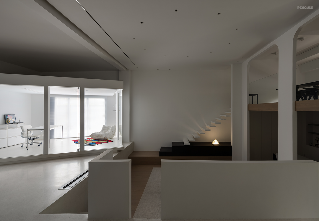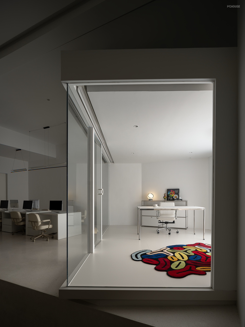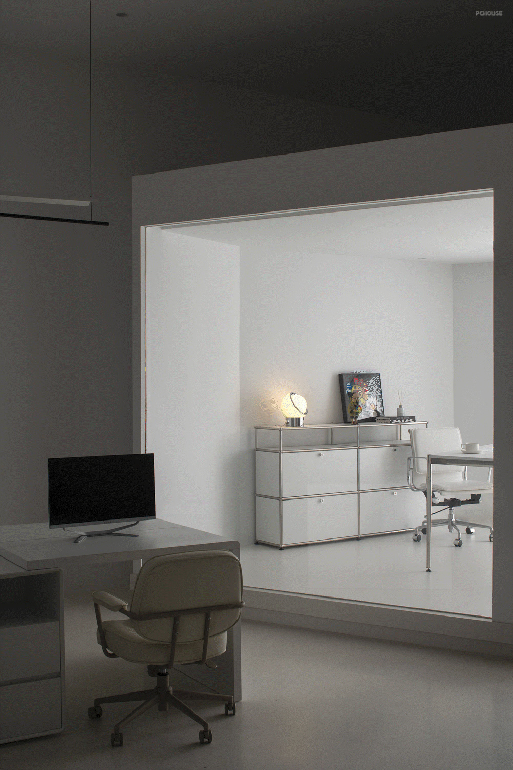 白色作为包容的色彩,在空间自然链接起不同的区域。而视觉上,整体有着明显的分区边界,便选取基础的色调,不强调过渡的色彩转换,这使得空间更多的为功能性服务,以减少复杂色彩带来的视觉干扰,从而形成空灵的场境。