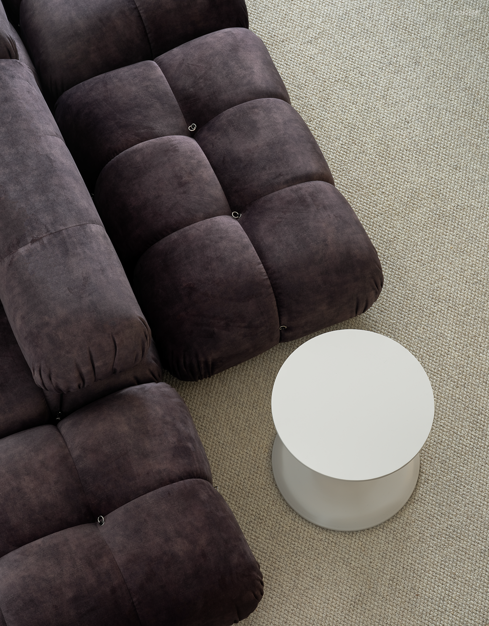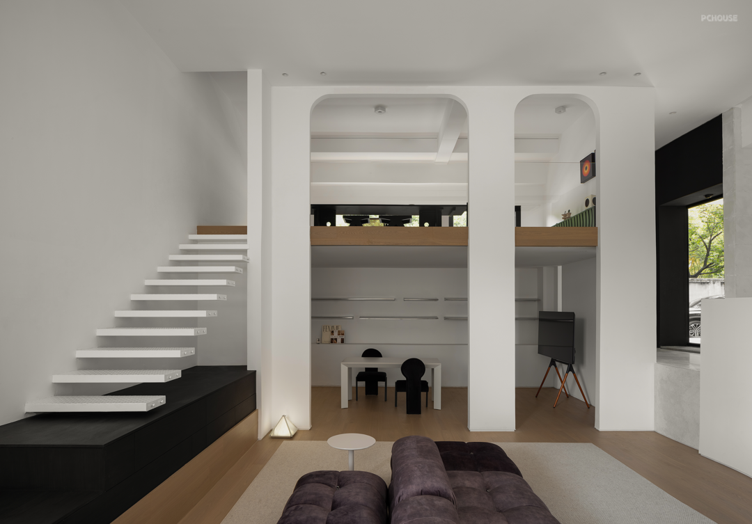 有界之中又充满着无边界感,两种设计元素的对冲在局部碰撞融合,建筑的体块被拉长,形成上下贯通的视觉路径。暗紫色的布艺沙发与木质地板相映衬,两种材质的交叠让空间在细部也有值得琢磨的质感。于是,对空间的探索便成为一种人与现实的共鸣。