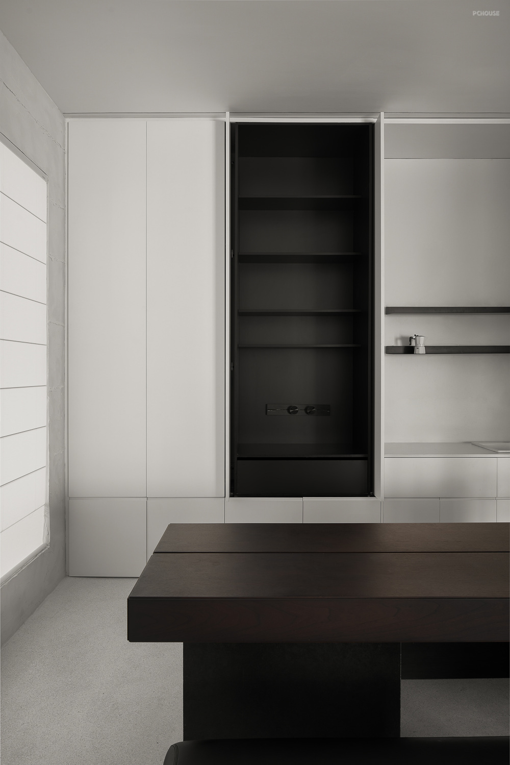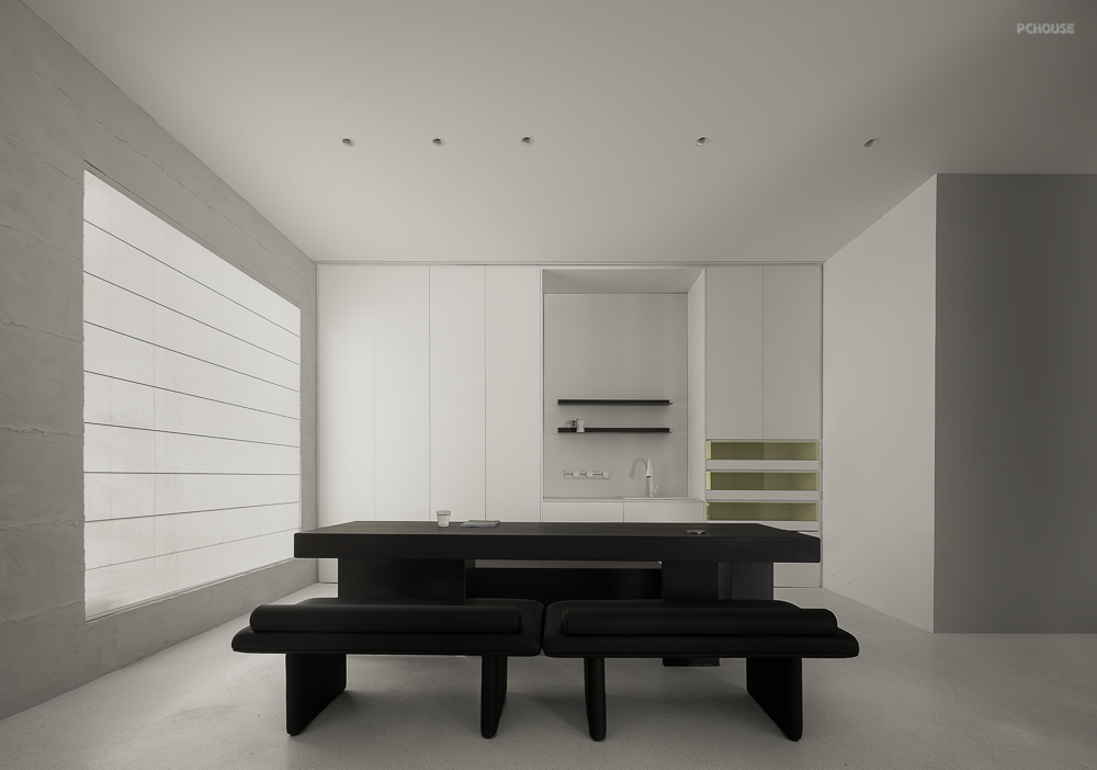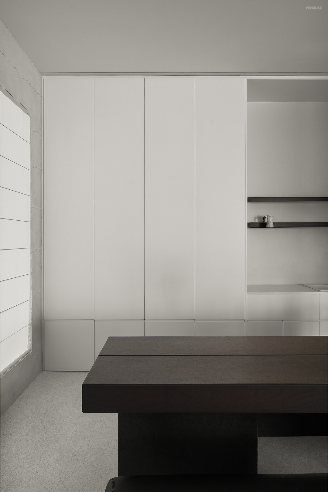 天花板块遵循从简的设计理念,简而有序,形成场所独特的秩序感。通透的顶面缩小了高度的使用面积,避免层高带来的压抑感。窗户亦延续此效果,拉长的面积将外景引入室内,提升了整体空间的尺度。柔和光影的投入,如同幽闭岛屿的一隅天光,静而思之,温馨的氛围由此发散。