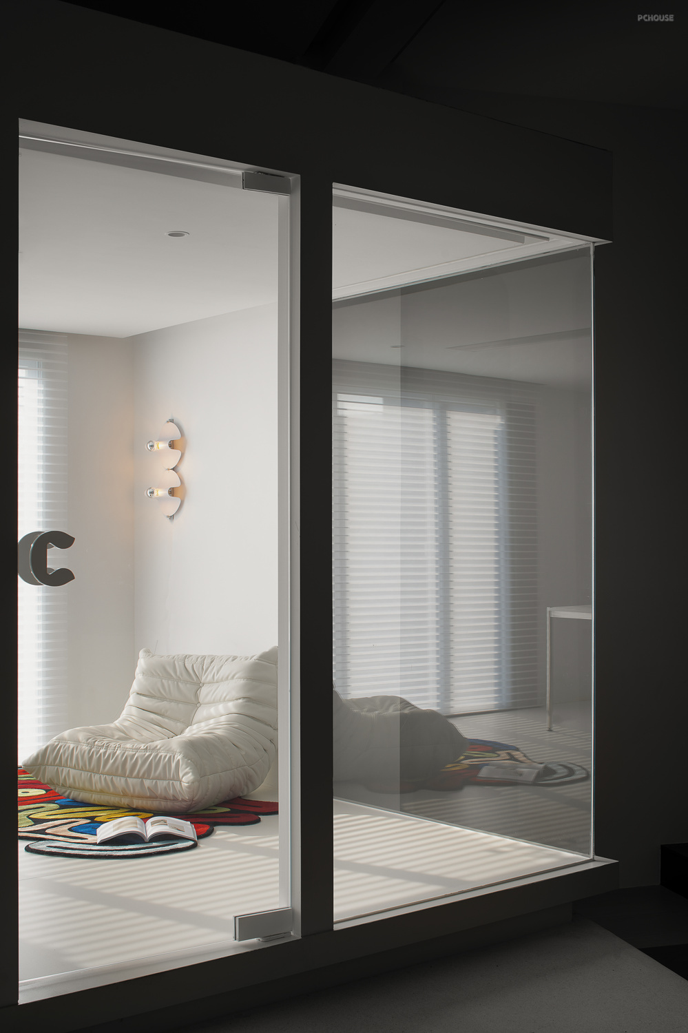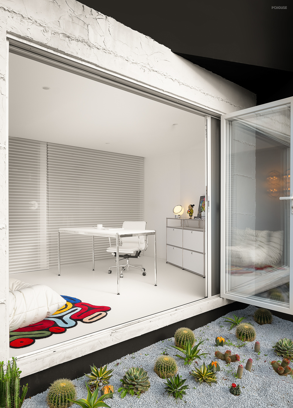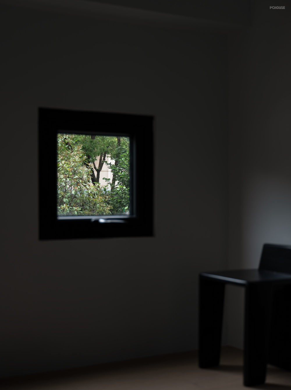 天花板块遵循从简的设计理念,简而有序,形成场所独特的秩序感。通透的顶面缩小了高度的使用面积,避免层高带来的压抑感。窗户亦延续此效果,拉长的面积将外景引入室内,提升了整体空间的尺度。柔和光影的投入,如同幽闭岛屿的一隅天光,静而思之,温馨的氛围由此发散。