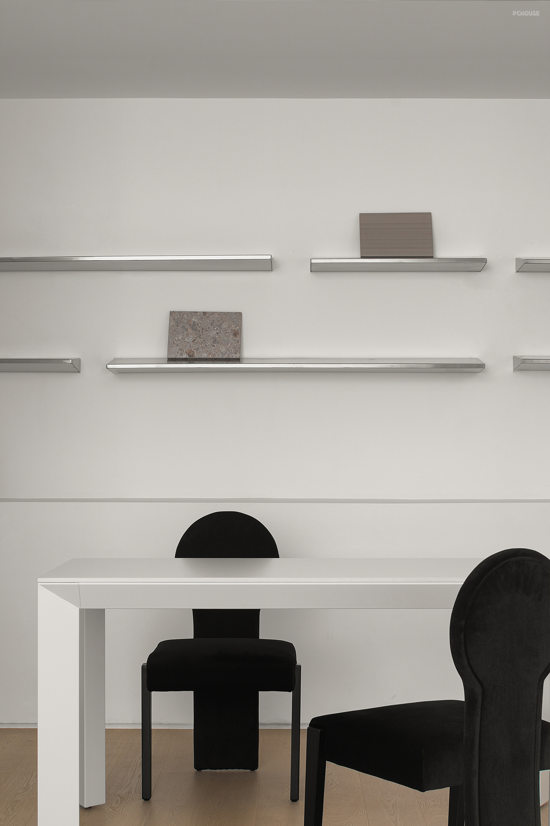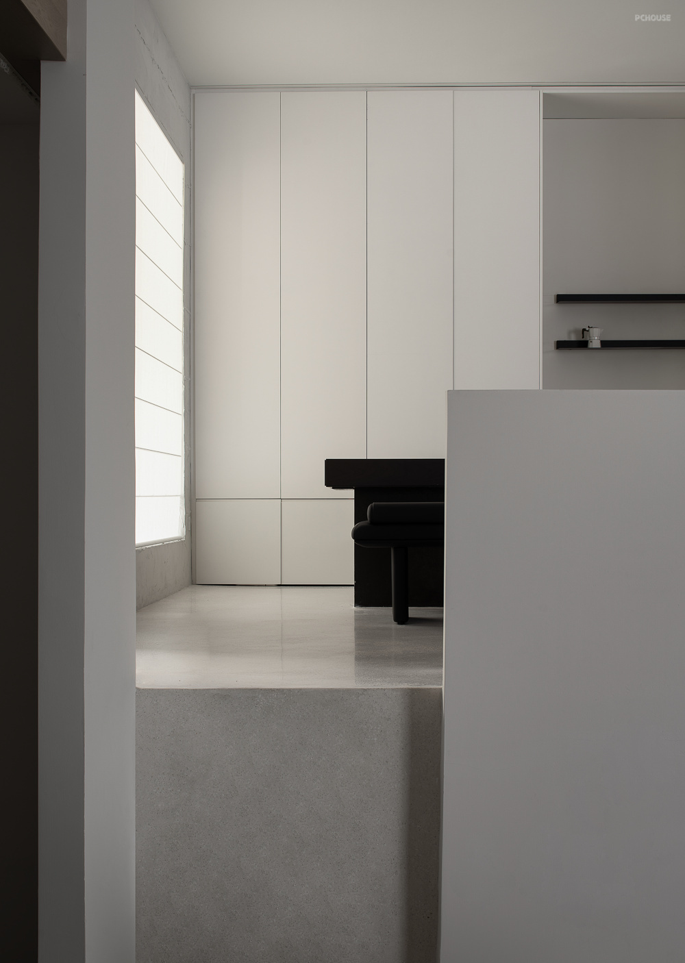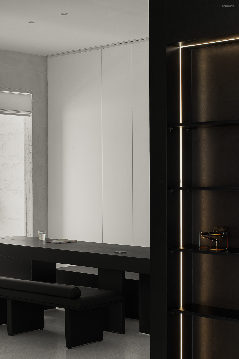 在空间的界限中,运用理性的设计重构秩序和规则,进而形成一种突破和创新。以极简的黑白灰线条构成空间骨架,转折或是透视,空间关系层层递进,传递一种微妙而深远的空间张力。
