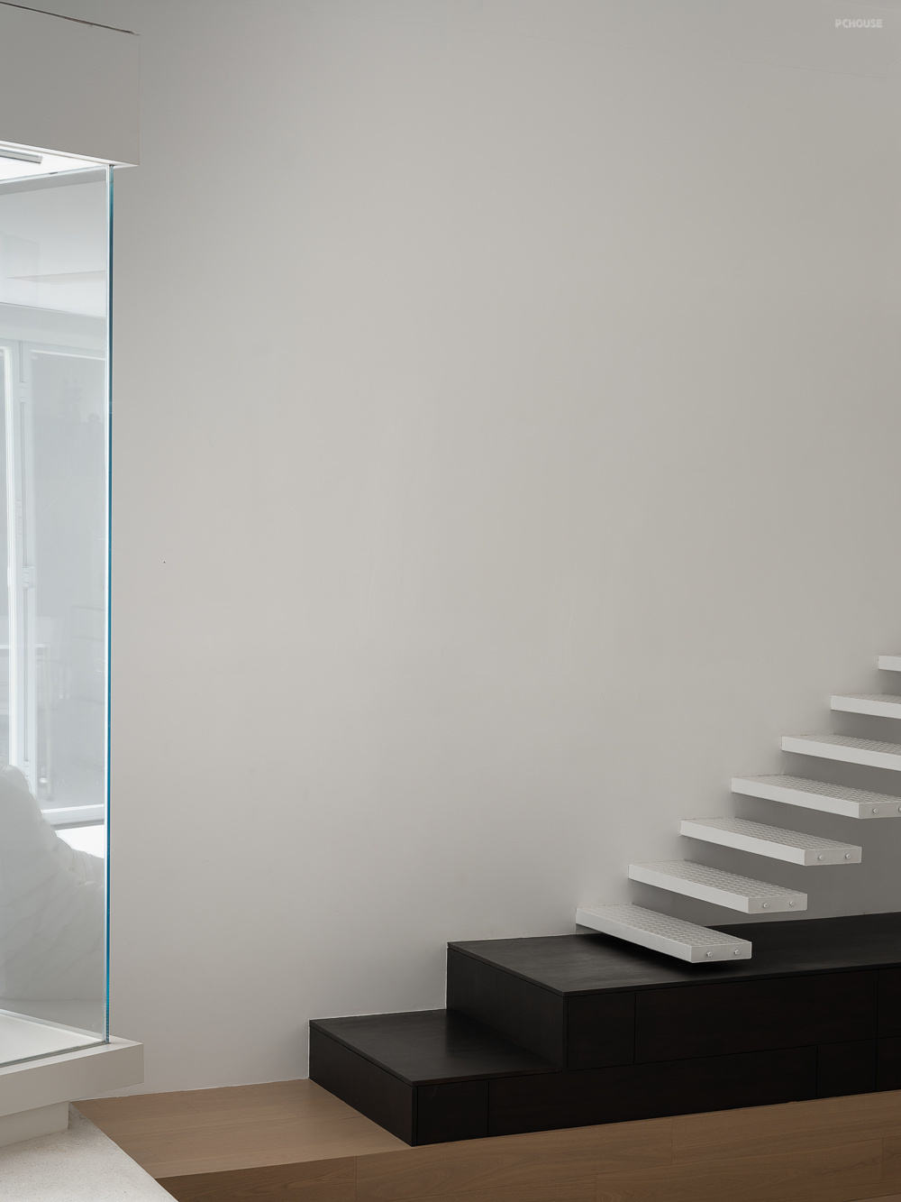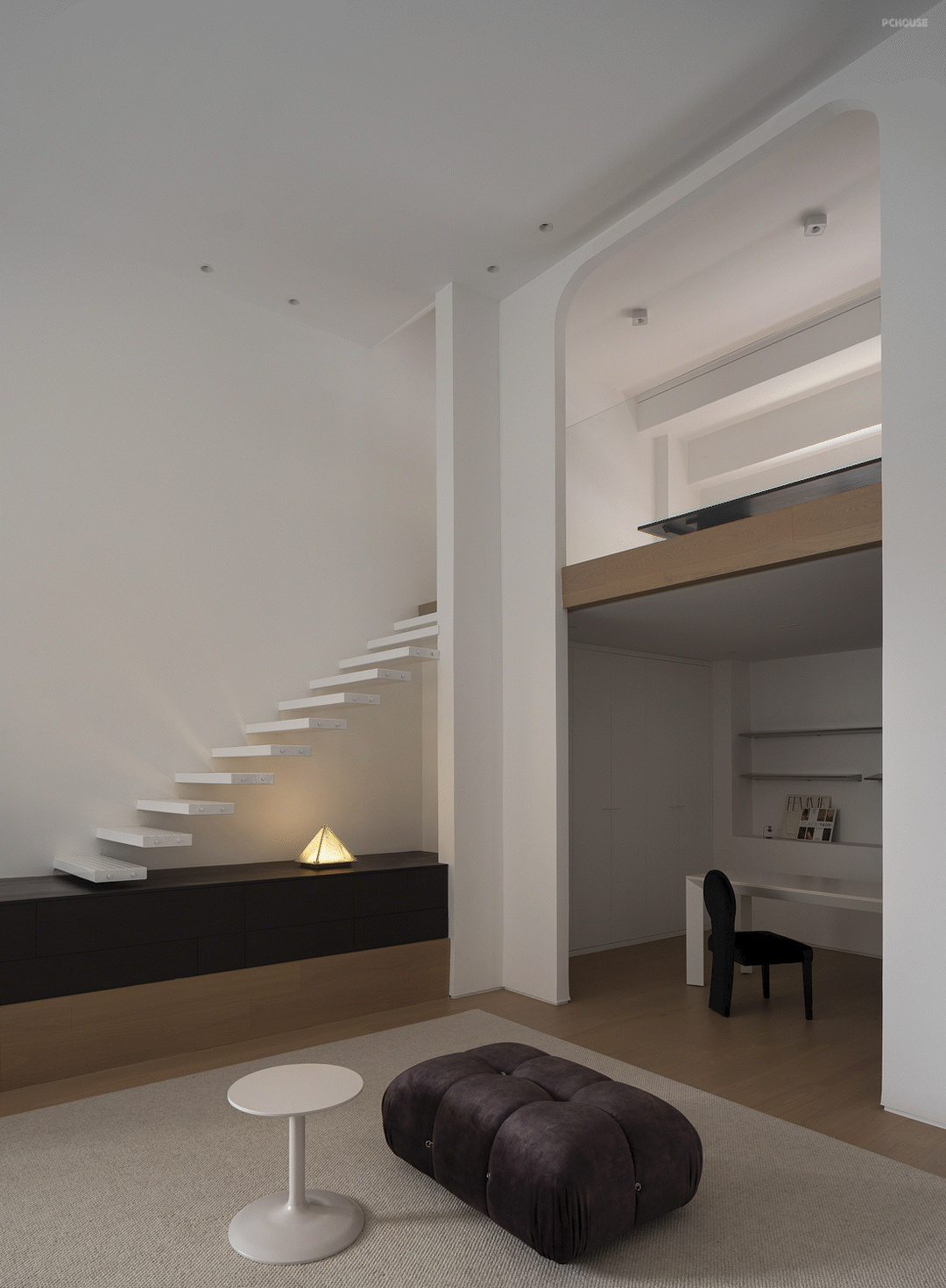 在空间有限的情况下,如何去减少内部的厚重感,是至关重要的设计导向。在一个年轻有趣的家中,营造活跃的灵动感是至为重要的。而悬浮楼梯的设计便成为跃层的首选。底部的两阶踏步选用延长的设计,延长的隔断兼具收纳的特性,同时正下方灯饰的加持,又填充了空间的饱和度,增加了光线的明暗对比。