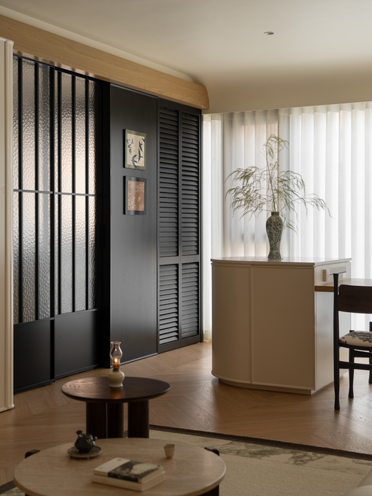 关于空间的第一印象,是整体的材质带给人的视觉冲击。拼接的木板背景墙,于侧面环绕出流畅的弧形曲面。直角与弧线的交织,不规则元素的嵌入,在空间中碰撞交融,以形达意,以至聚合的圆满。与之搭配的布艺沙发亦叠加了空间的氛围感,磨毛的亲肤感与木质地板作力与美的呼应,带来温暖的家庭体验。