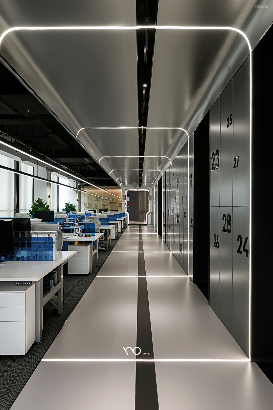 过道处的灯带设计,借鉴了时光隧道的概念,灯从顶到地围陈圈,在哑光面钛合银的衬托下,等比例延申至尽头,让即将进入工位的员工,犹如在星际穿梭一样。