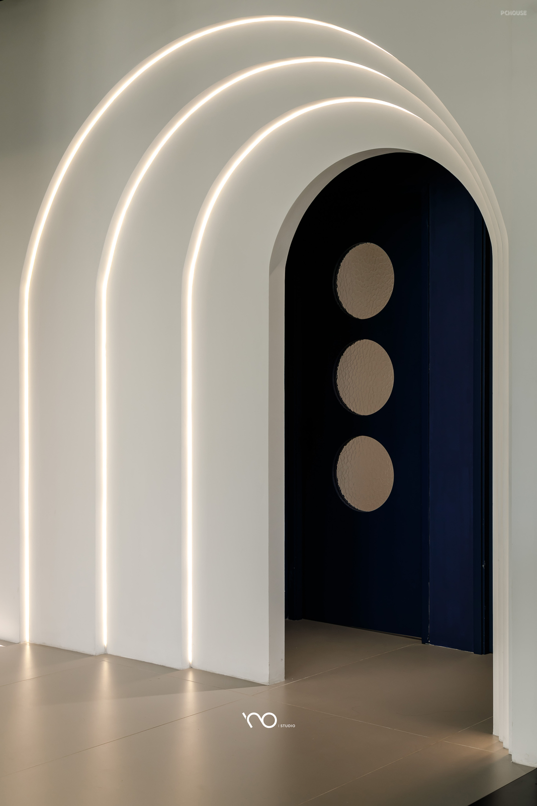 与此同时,成弧形排列的亚克力隔断,悄然将前厅与接待区分割成两个区域,但透光的布局又将它们连接在一起,灯光如月光般温暖舒适,科技与未来成为这个空间的主题。
