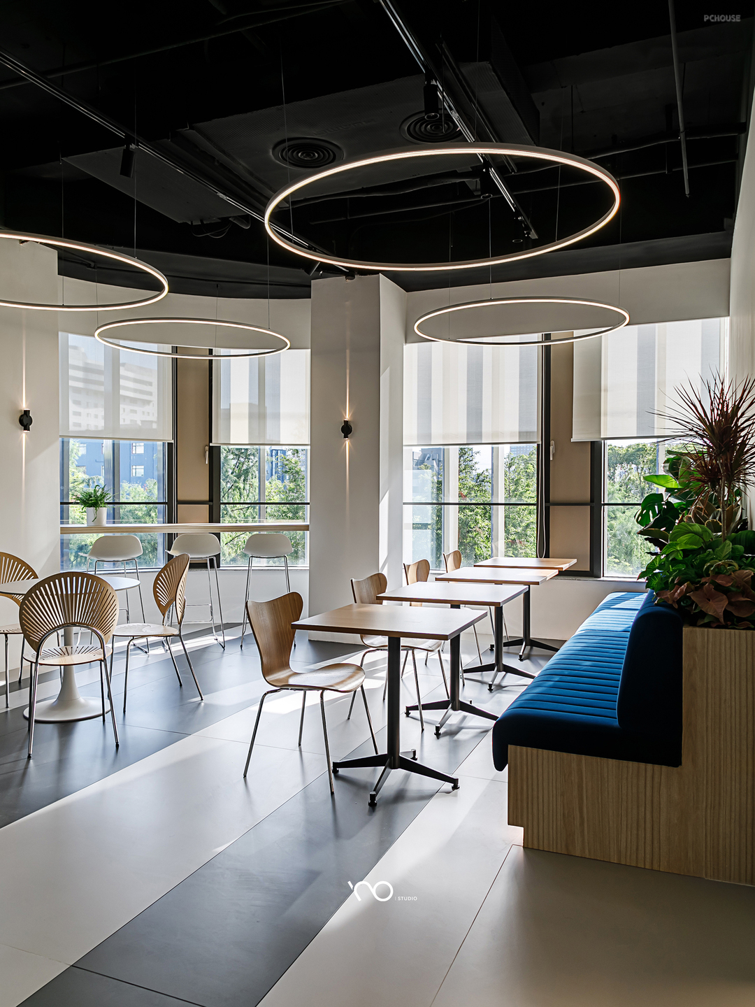 小会议室是沉浸式的蓝色体验,适合3-4人的小型会议,顶部的灯膜加圆形灯带来自星球及其轨道的设想。蓝色木门上的三个圆形透光玻璃设计,增加了空间的趣味性,舒缓着开会时的严肃气氛。