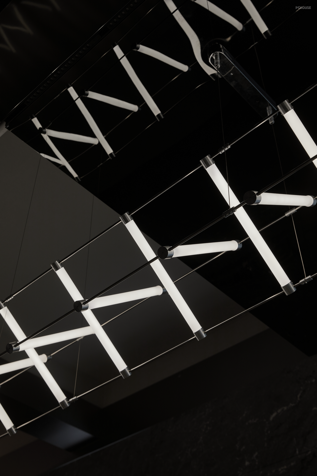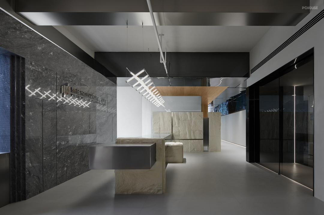 上方的马扎灯将“穿插”的概念复调,以艺术的方式增添空间的活性。大面积的白色石墙砌垒,呼应台基的同时与相对的木板材质形成整体空间调性的平衡。多元的材质运用侧面体现出建筑公司的特性。
