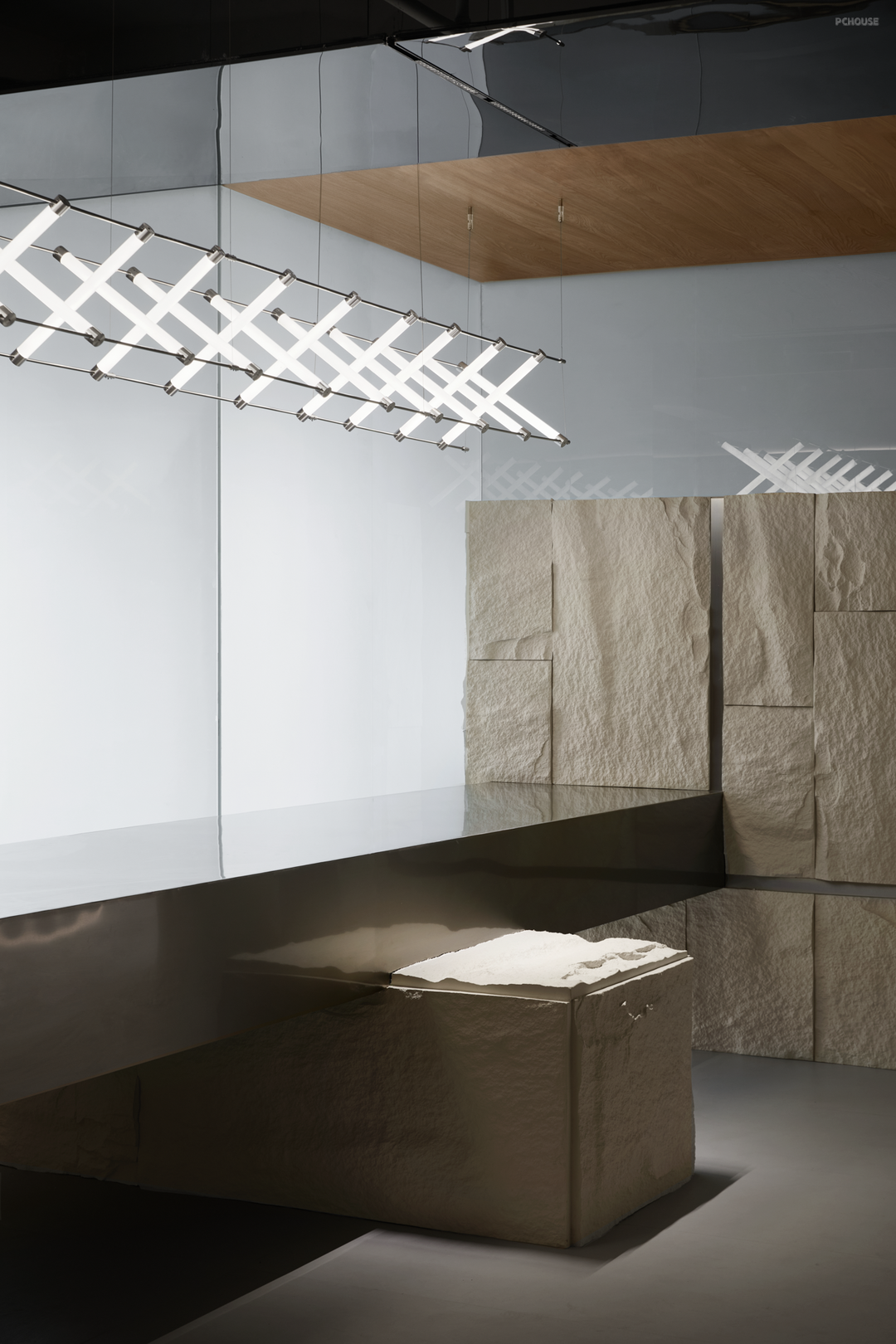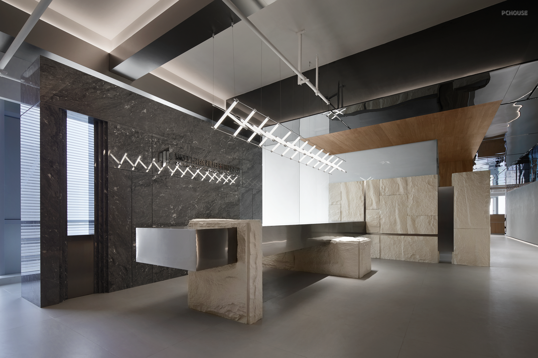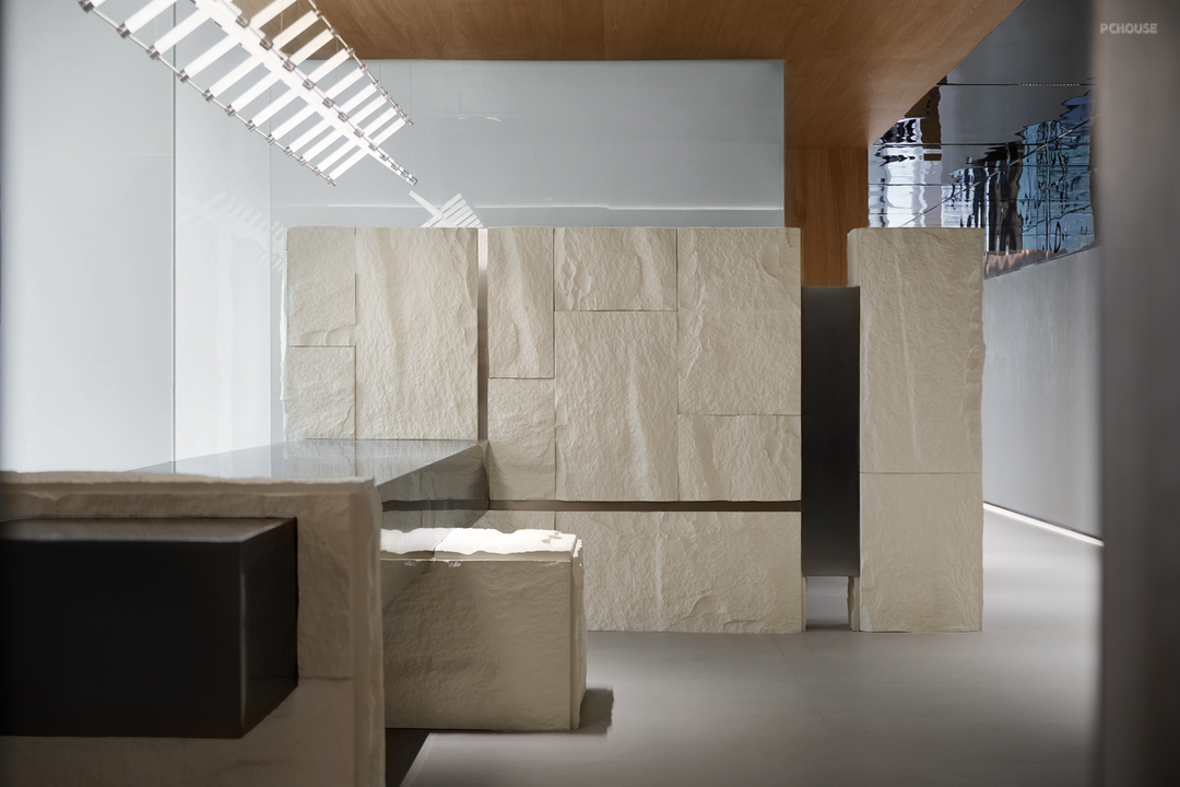 金属台面以超长的形态贯穿起前台左右两侧区域,犹如透过包装而窥探到的架构本质。白色凹凸不平的石皮与银色光滑金属的肌理搭配,碰撞出不一样的质感冲击。