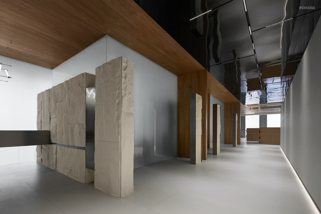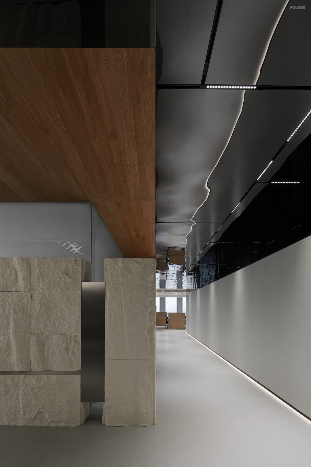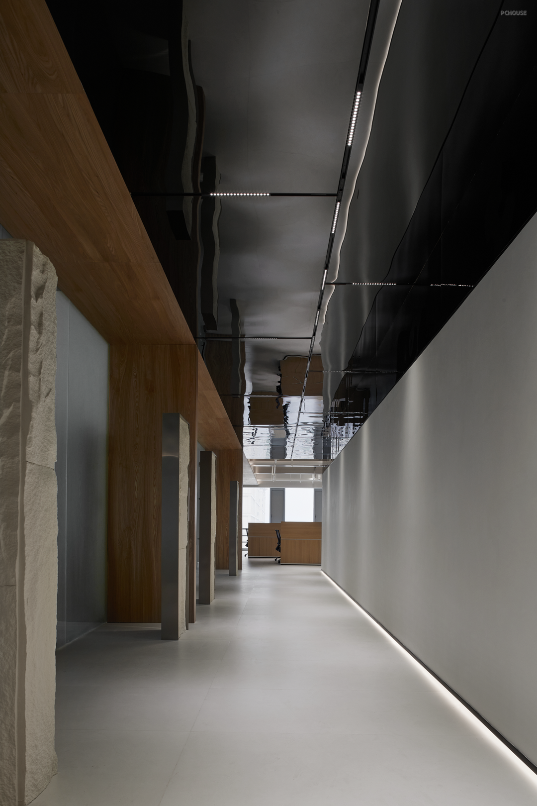 通道一侧的成排白色石墙,传达着建筑公司特有的内张力,保留趣味性的同时也起到引流办公人员进入工作区域的作用,使得动线明晰。