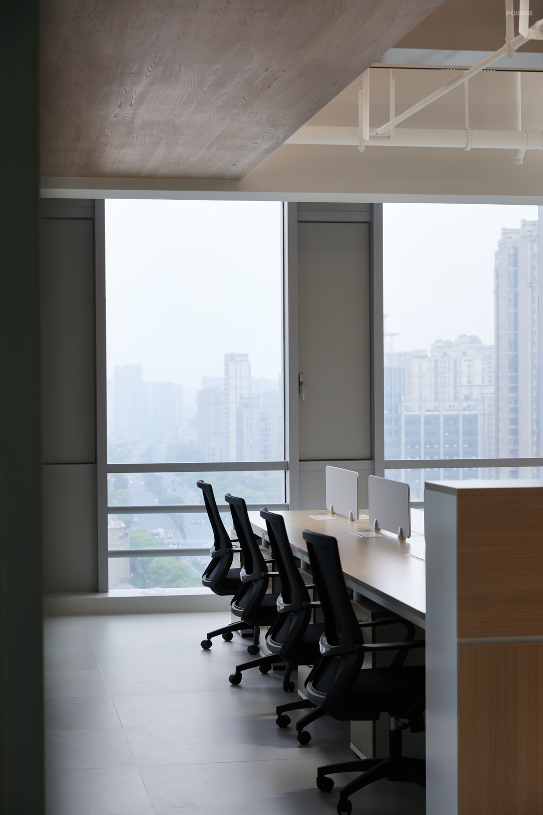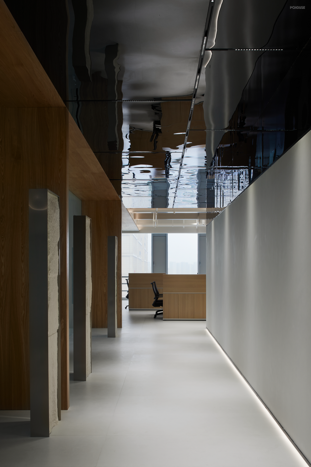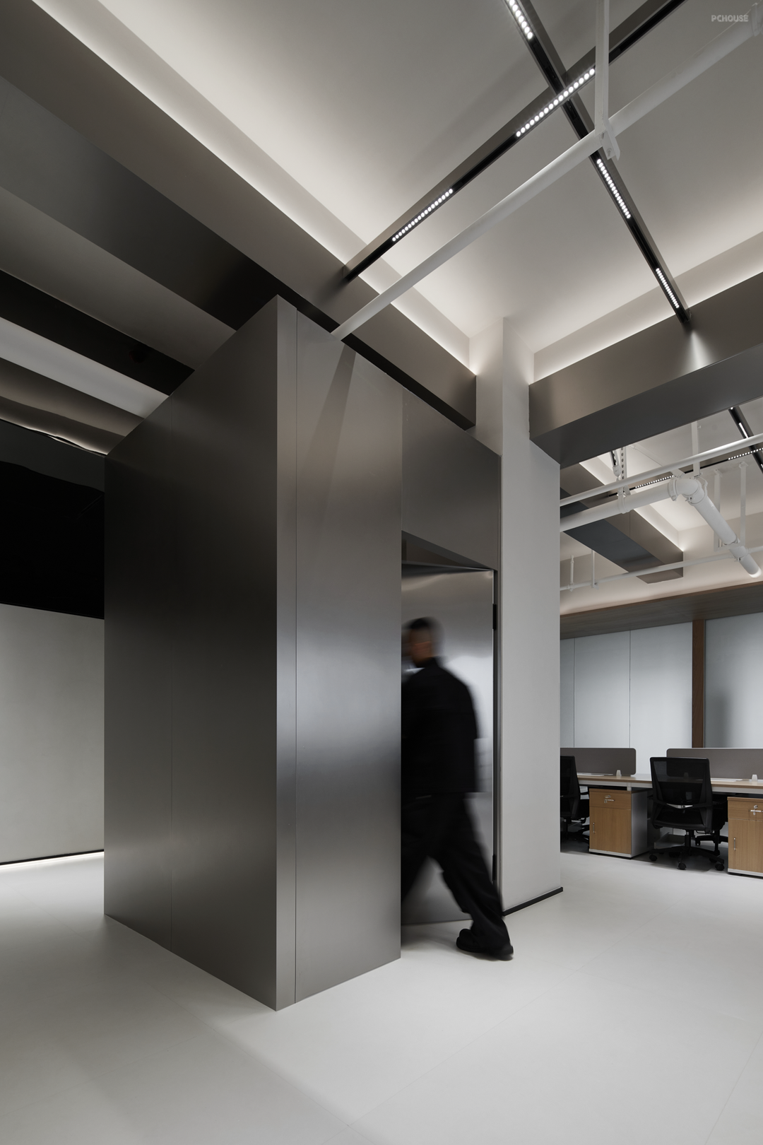 独立办公室外侧的落地油砂玻璃体现出半透感,让微光连接空间,既包含独立的私密,也延展了交互。微水泥的地板与木纹材质墙面中和了庞大空间带来的压迫感。