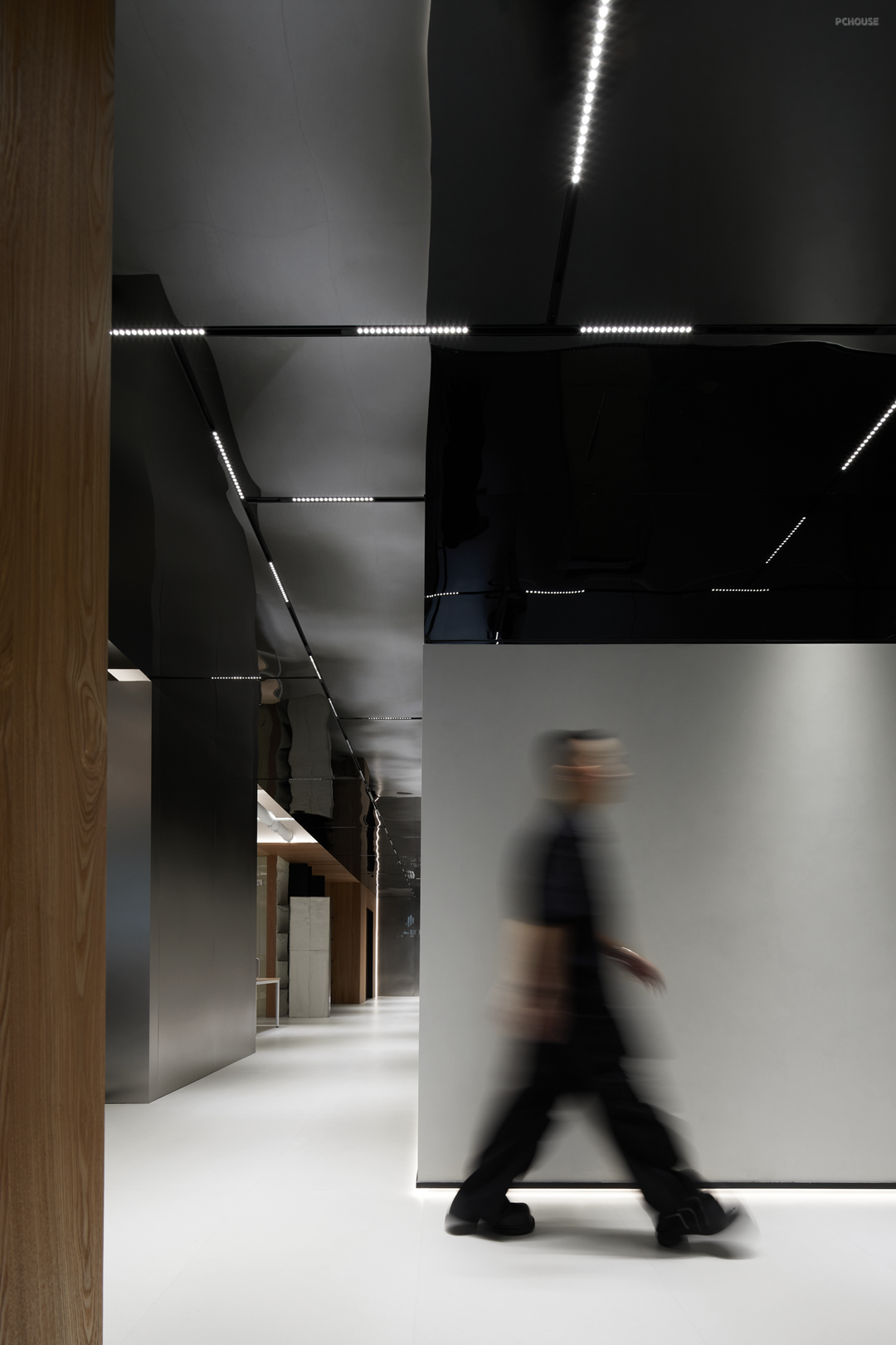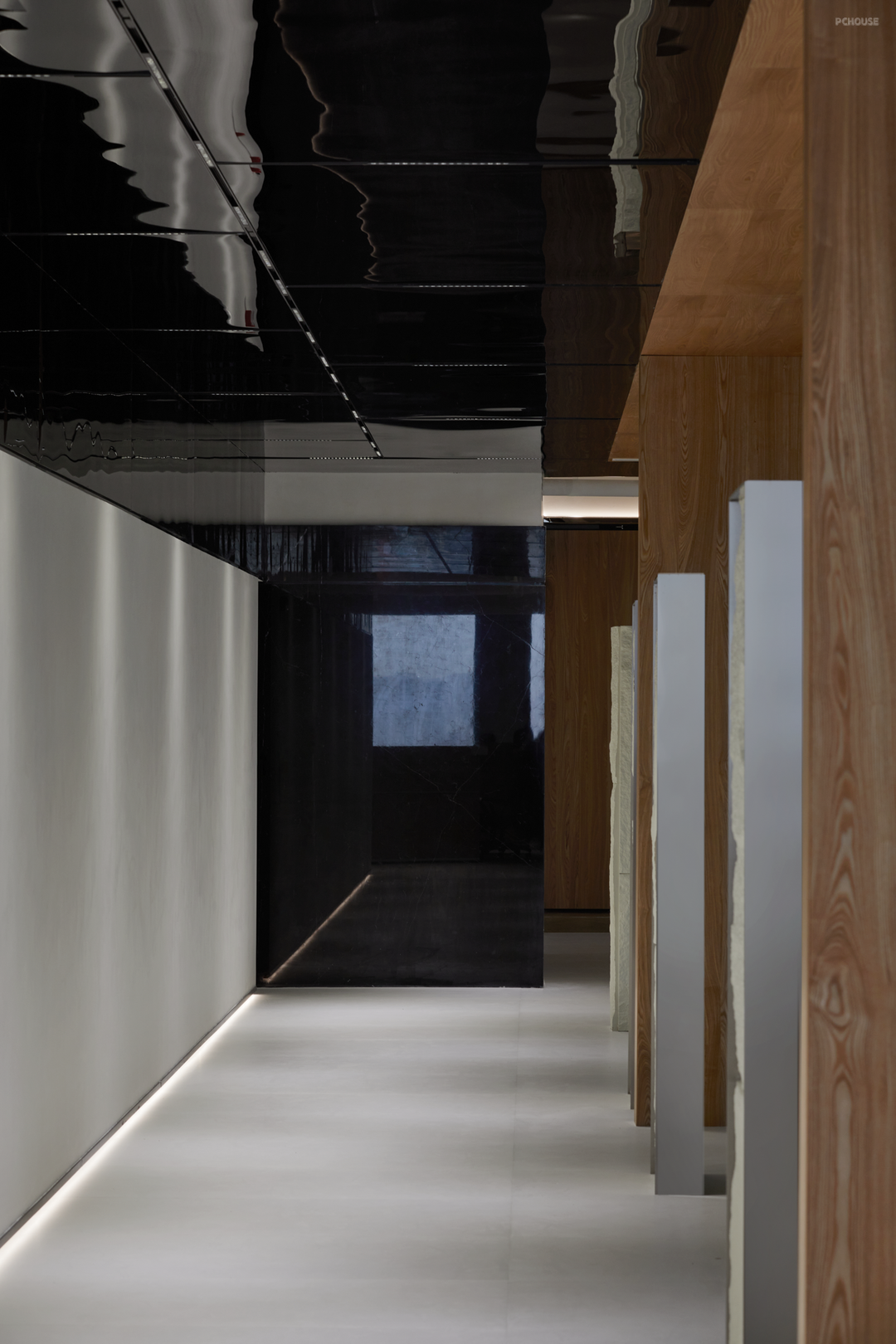 为了解决原本L户型的较长通道所带来的逼仄感,设计师选择了铺设大面积黑色镜面吊顶,使反射的光线照亮了过道空间,驱散昏暗,打破枯燥。