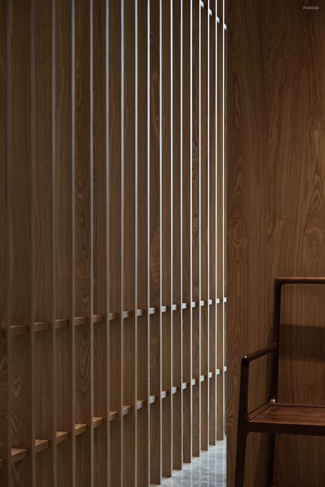 位于前台左侧的会议室配置了电动旋转门。非会议时间可以将其关合,充当一面木色墙体,引流人员向右进入办公区域。