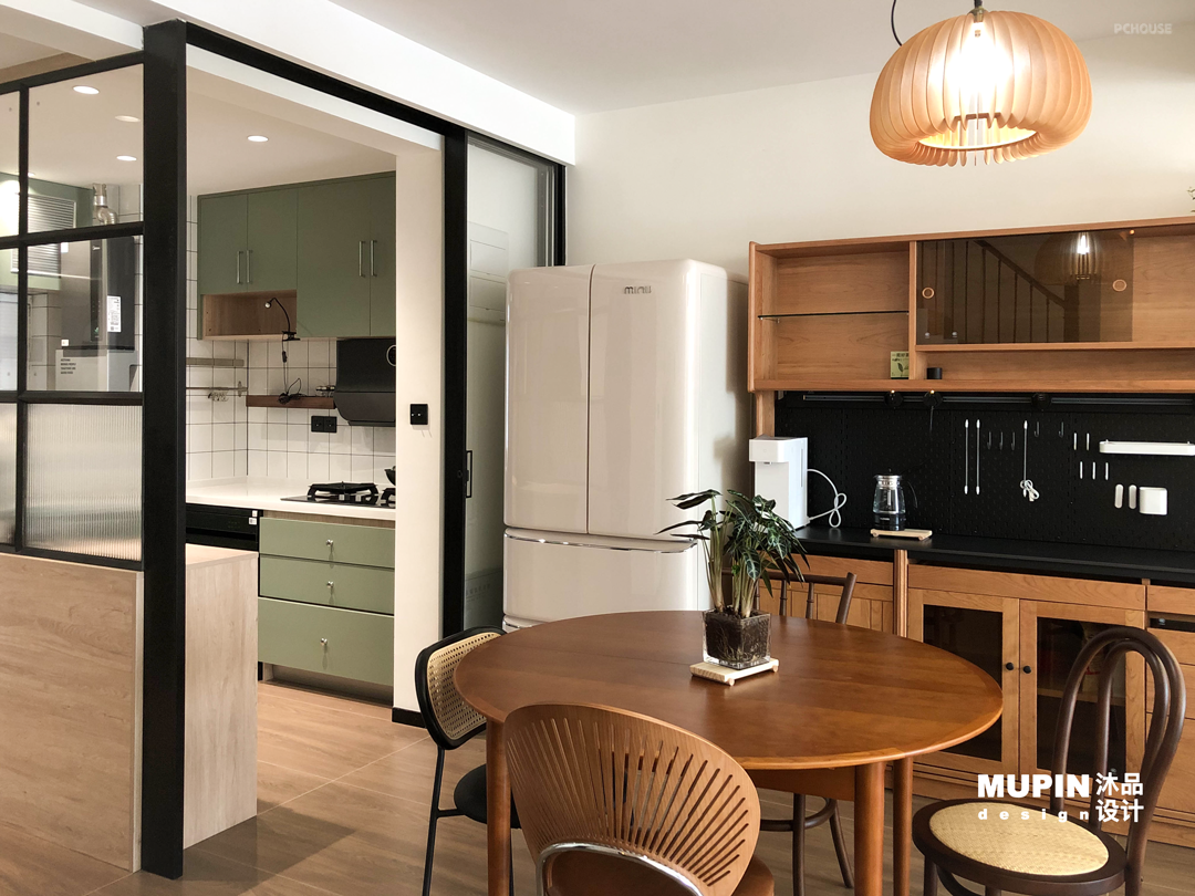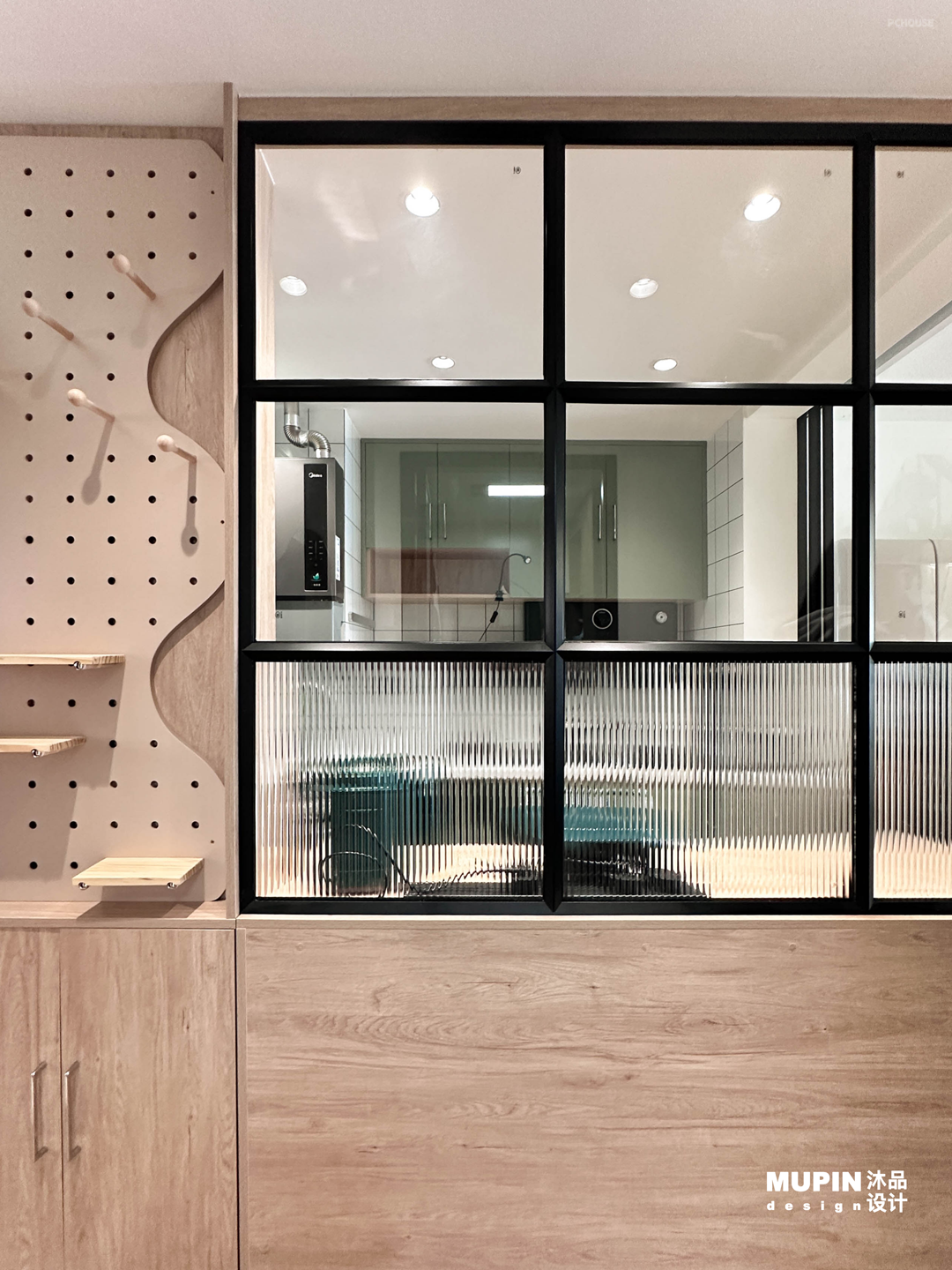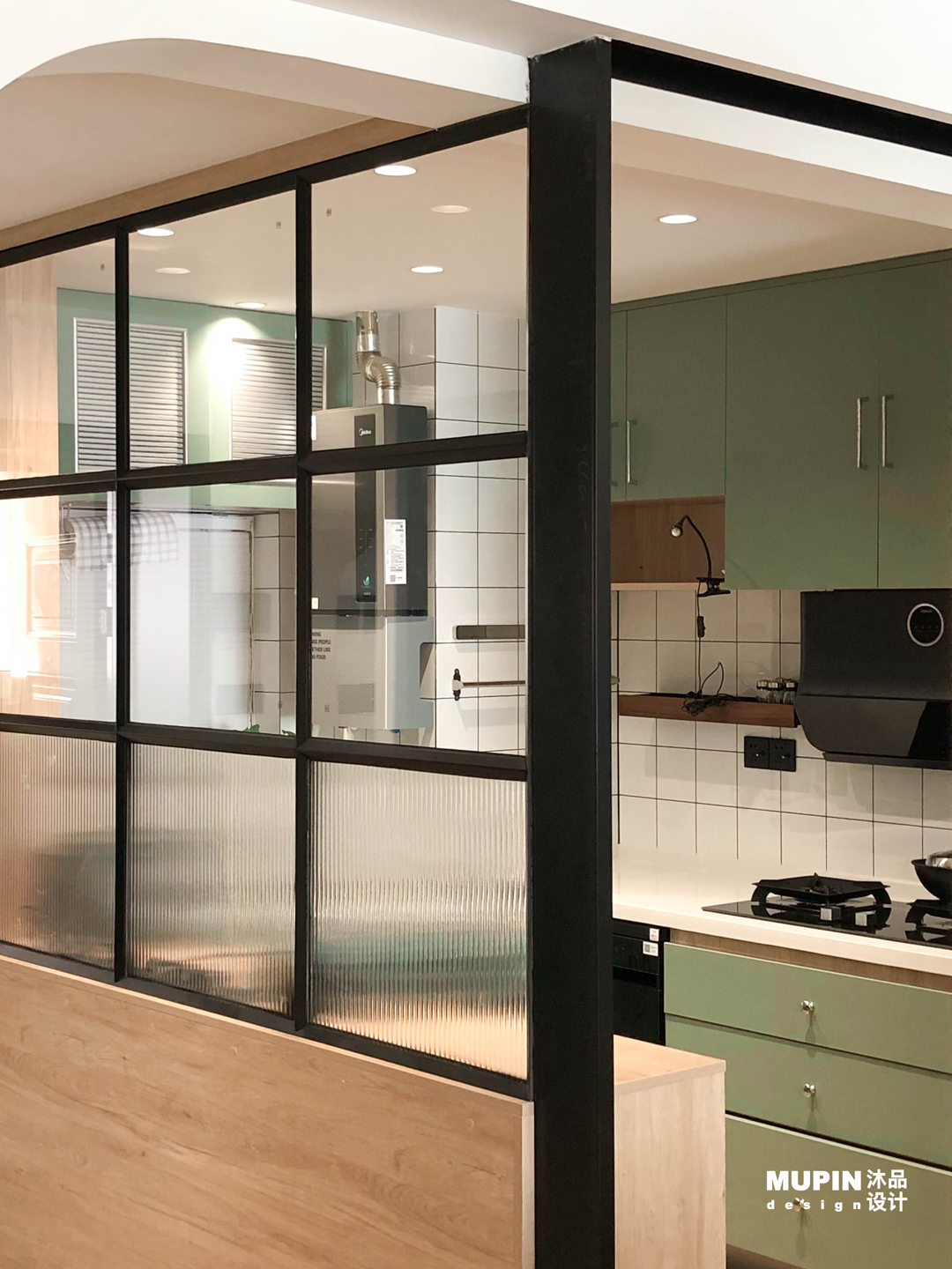 ①厨房的一侧墙体打通,改为玻璃隔断的半开放厨房,让光线更明亮。