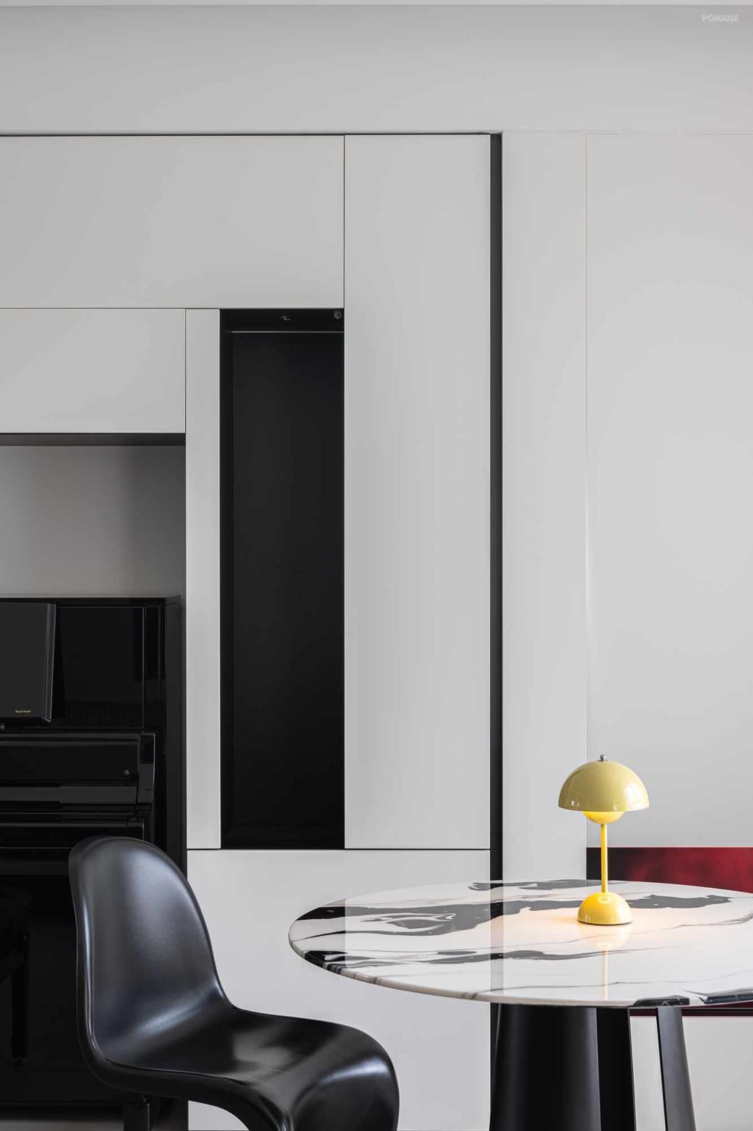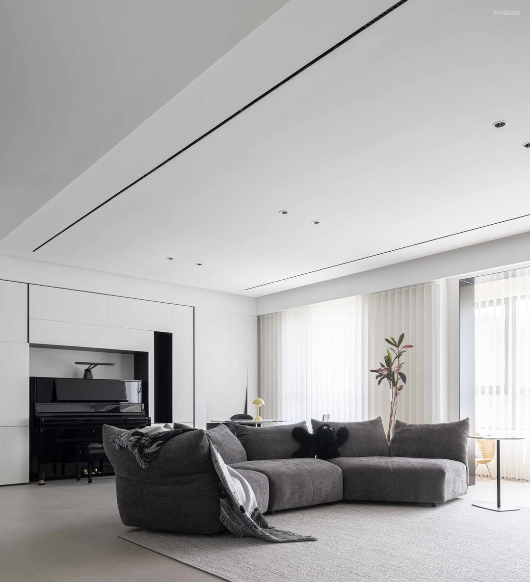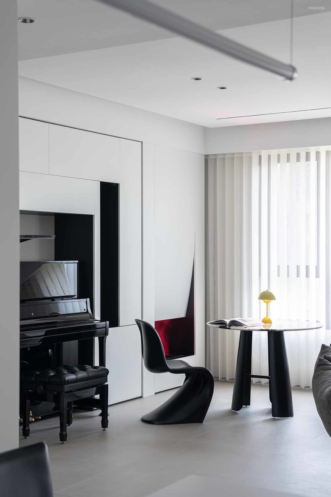 2.客厅设置钢琴区,同时靠窗打造休闲餐吧,合理控制空间比例,满足实用性的同时,空间布局更加合理舒适;
