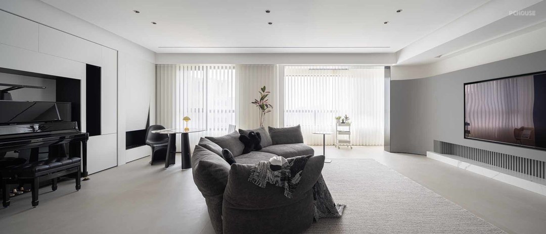 客厅以黑白灰为设计主张,统一整体色调,沉淀华光焕皎洁,净润流动似无边,大平顶无主灯,搭配开阔的大横厅场域,释放大平层的空间魅力,迸发现代简约的磅礴之美。