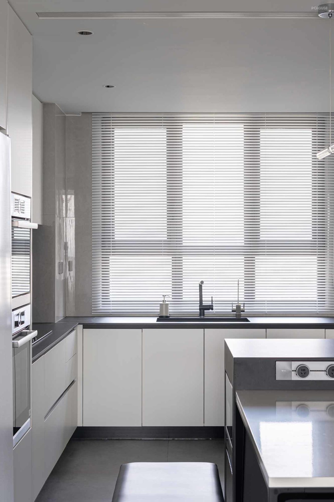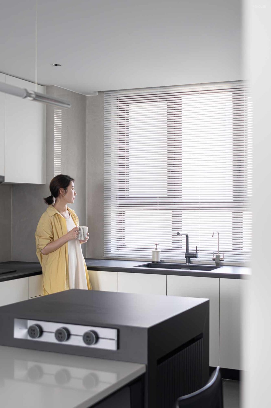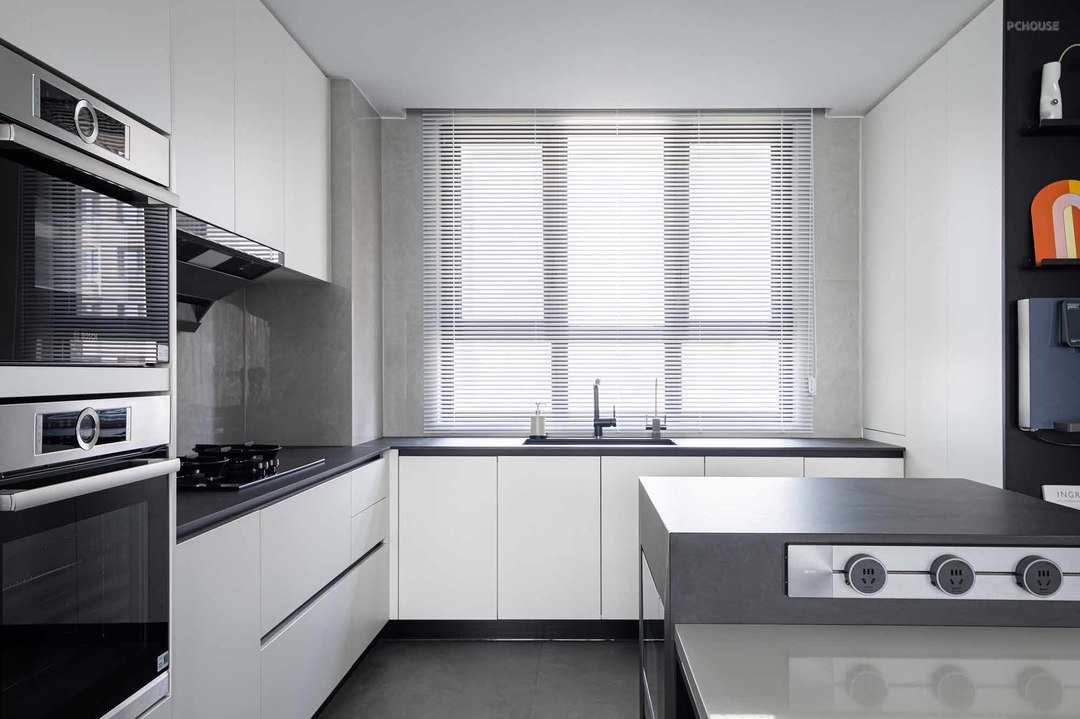 白色橱柜与咖灰色瓷砖的组合,宁静和舒缓的色调使得整体精致又柔和,光线充足净透,烟火气也变得精致起来。