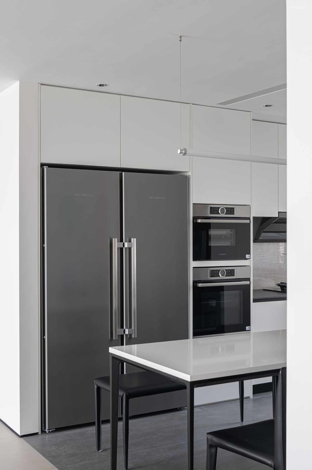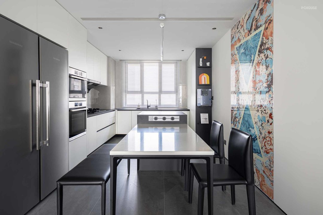 黑白灰色系延续至餐厨区域,将厨房打开做全开放式设计,餐厨一体更加便捷开阔,餐岛居中而置,动线流畅舒适。
