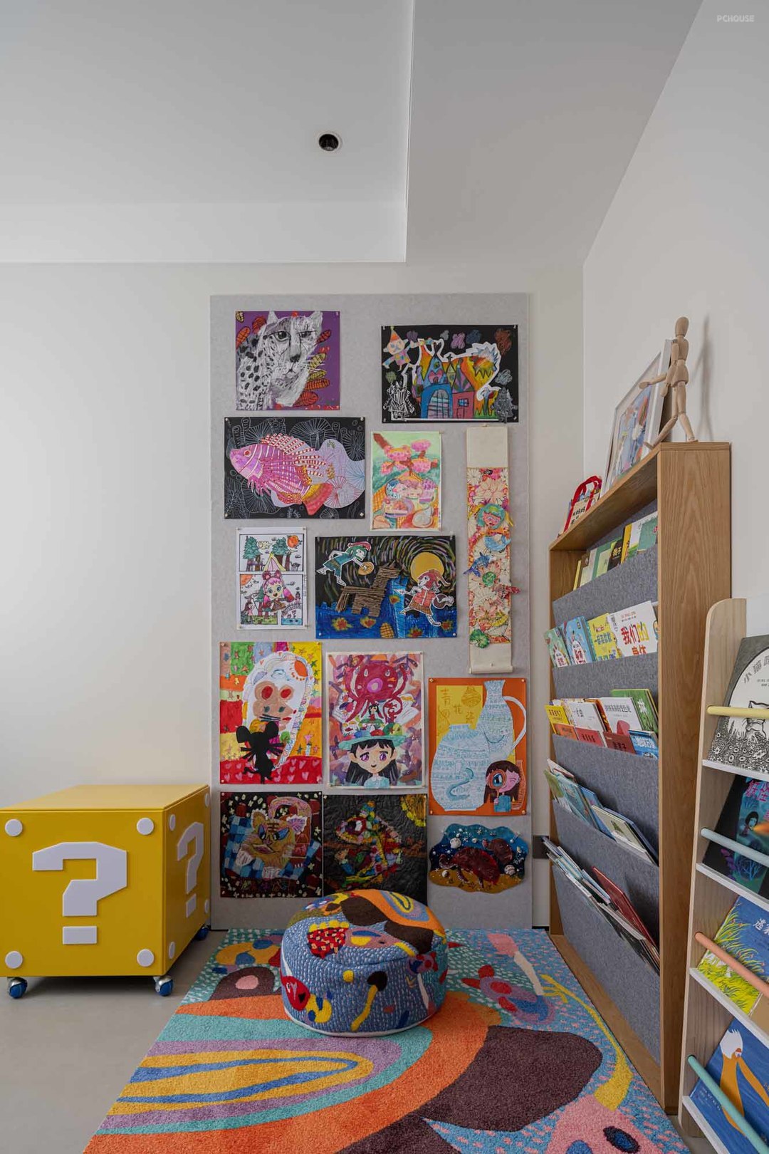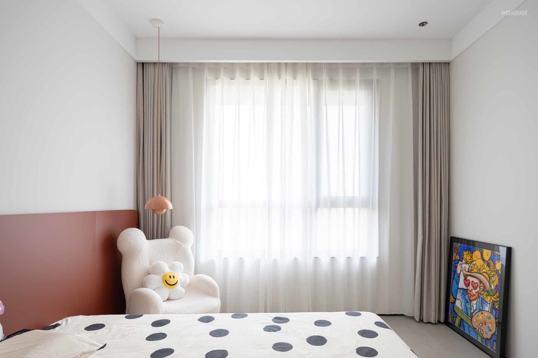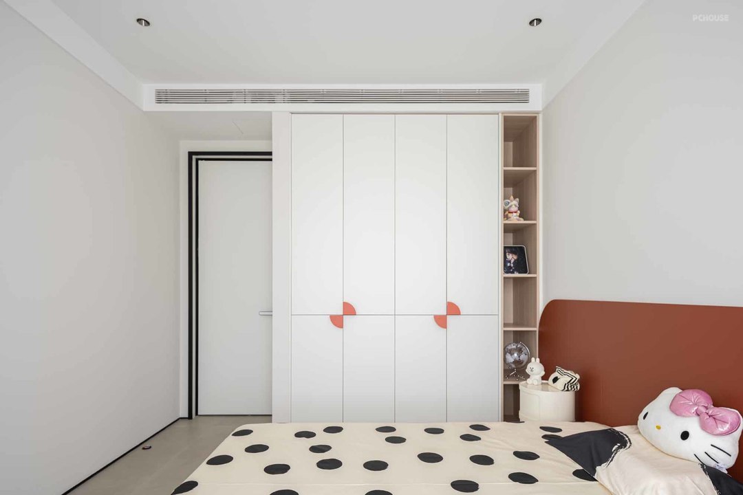 一改黑白灰的清冷感,儿童房色彩艳丽活泼,番茄红护墙板奠定空间调性,简洁却不失童趣美好。