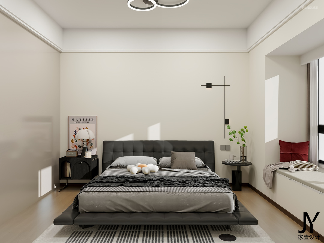 主卧运用了极简的色彩搭配,暗黑亚光的家居体现高级质感。