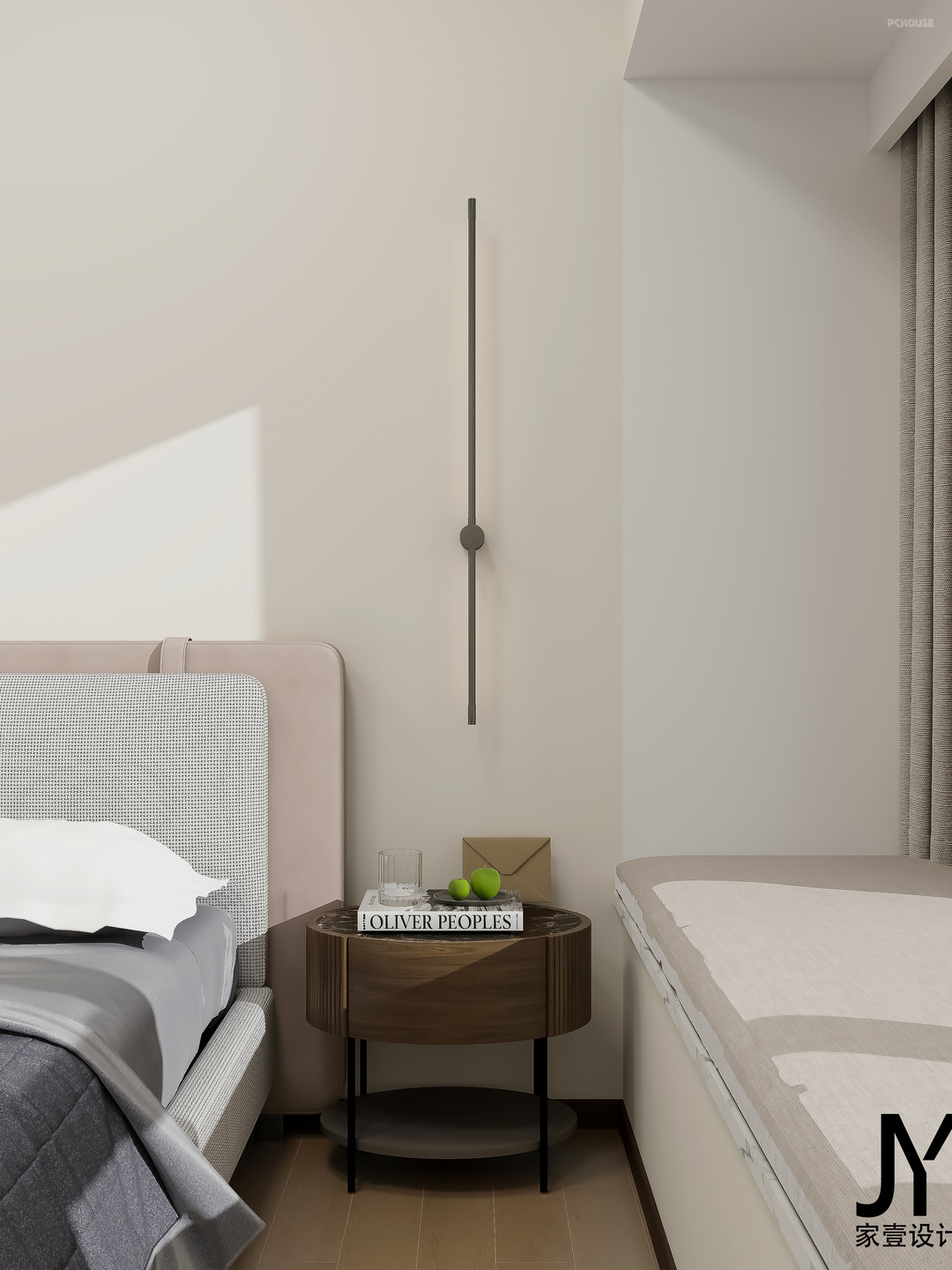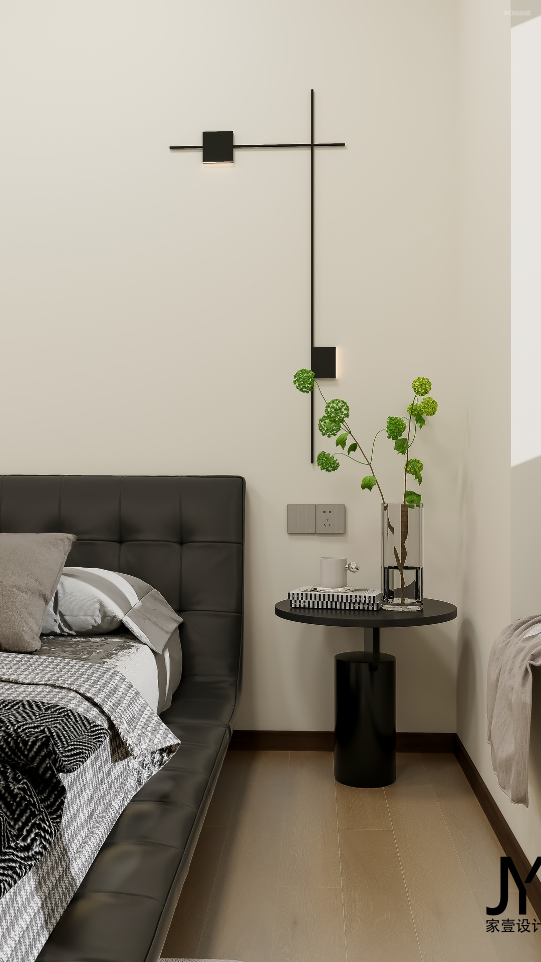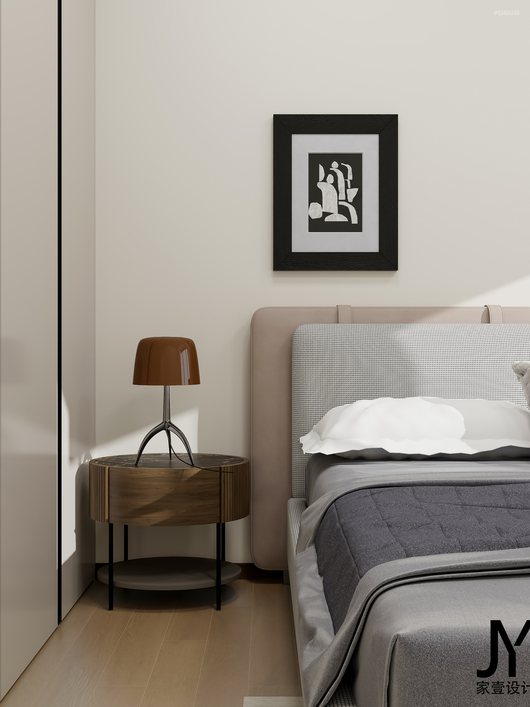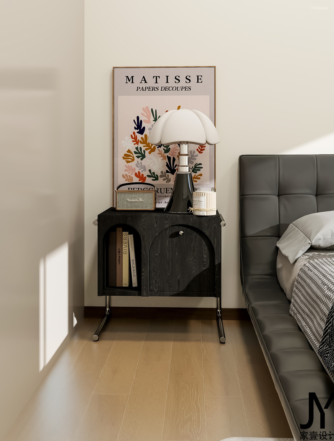 床头柜选用简单体量感小巧的床头边几来搭配,节省空间。