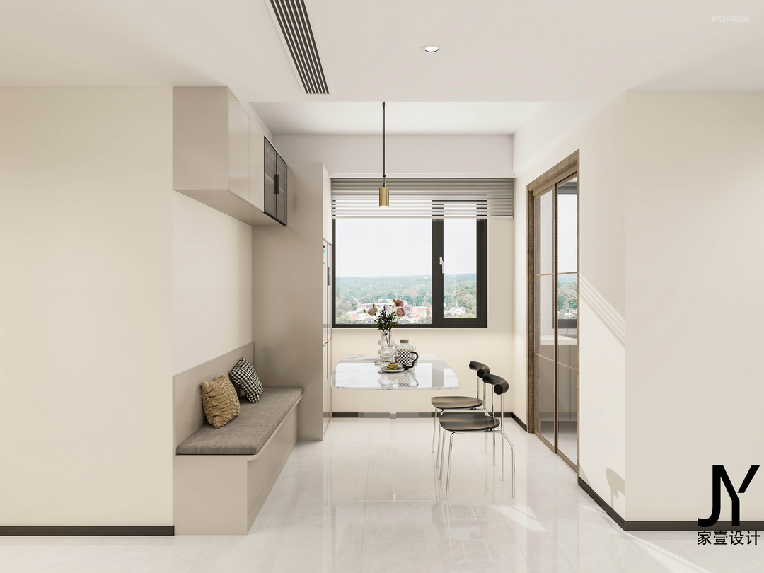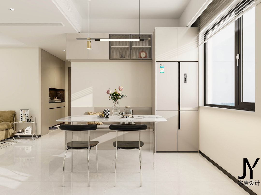 餐厅的设计结合了业主的实际需求,因为厨房位置较小,所以希望将冰箱放置在右侧靠窗位置,搭配吊柜。