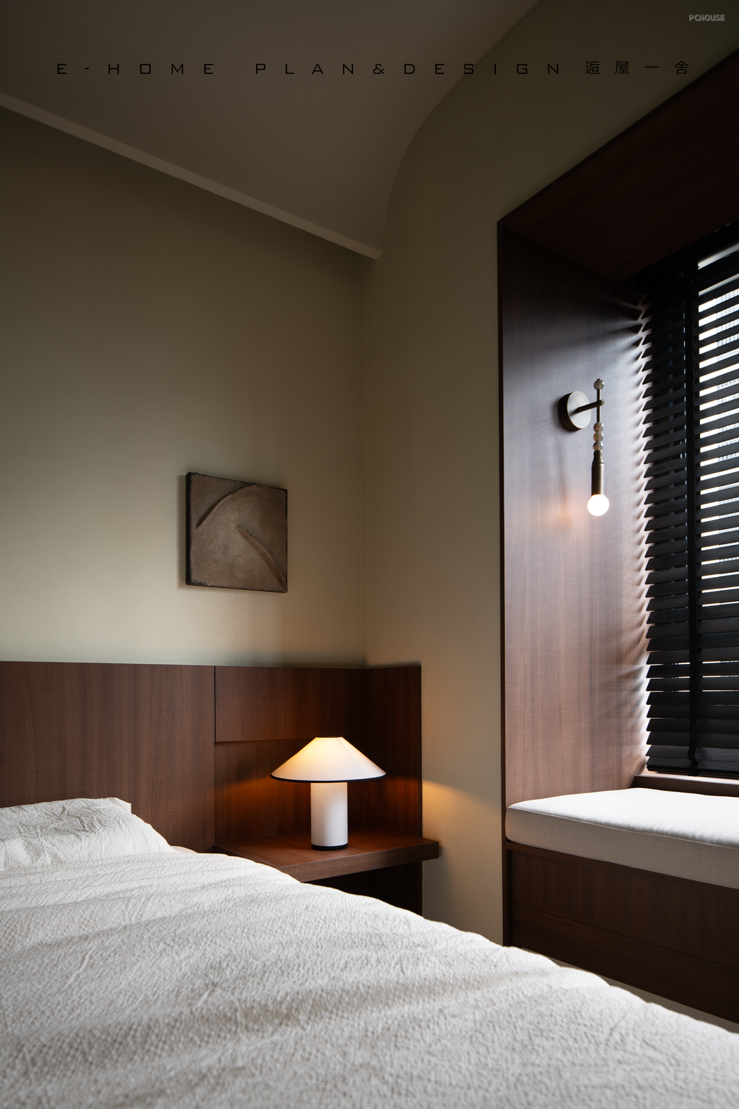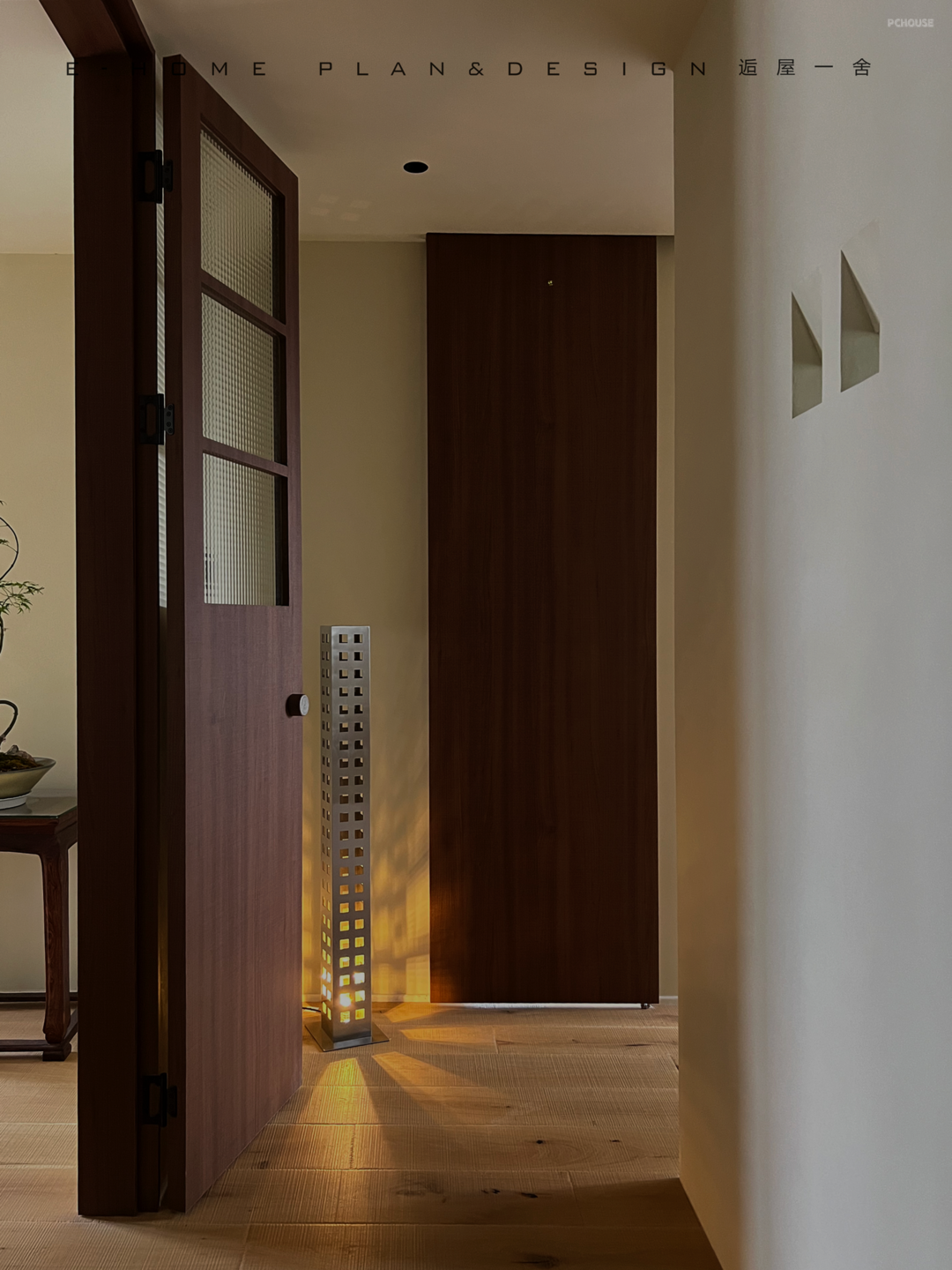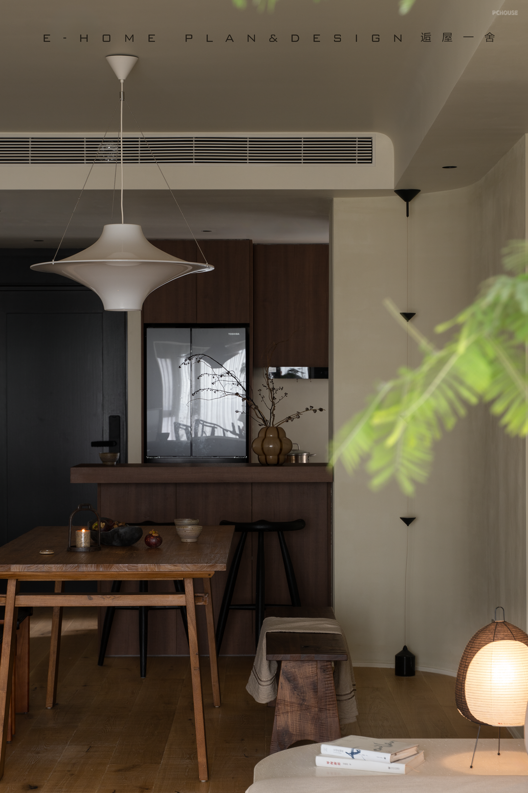 羊皮质感的艺术涂料和木色铺设大背景,在同一种色系里深入浅出,光线通过墙面反射再次补充照明,主灯不是必要的存在,空间反而多了纯净的感受