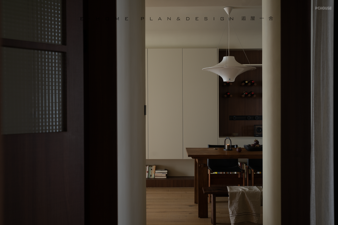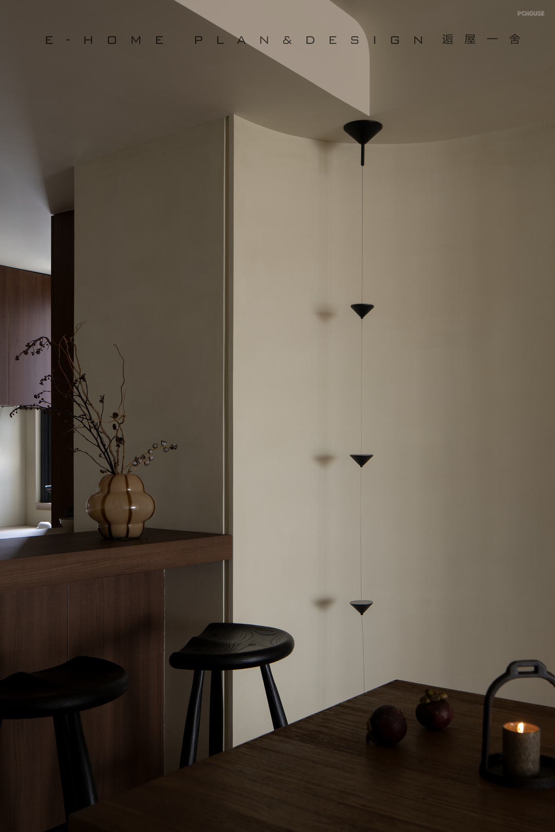 一整排柜子在餐厅这个部分保持开放的态度,水吧台和酒架嵌入,作为补充的餐边柜隐匿于整个大背景中,自由浪漫的海鸥灯让用餐氛围更胜。