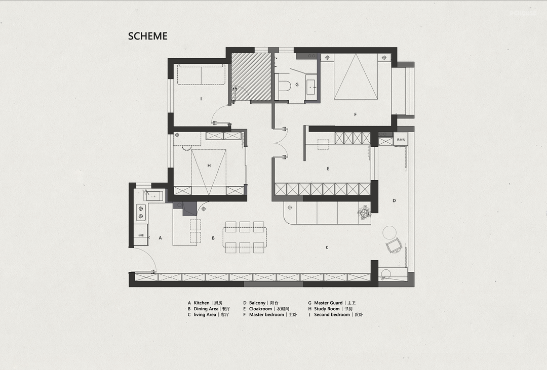 ➀全房亮光的地砖都改为木地板,拆除吊顶。➁布局重做,打造开放式厨房,合并两个房间为主卧,休息和收纳分区,更舒适。