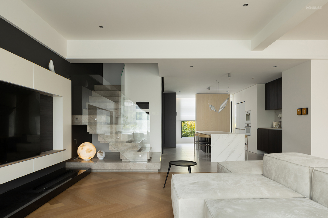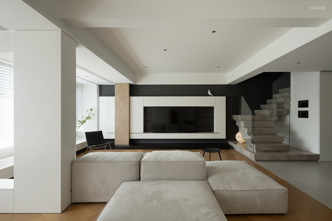 客厅作为家的核心,以开放式的设计引领整个空间。空间以几何柱体穿插为主线,块面拼接为支线,强调空间的高度和引力,对空间分割和串联,调动出协调稳定的画面。