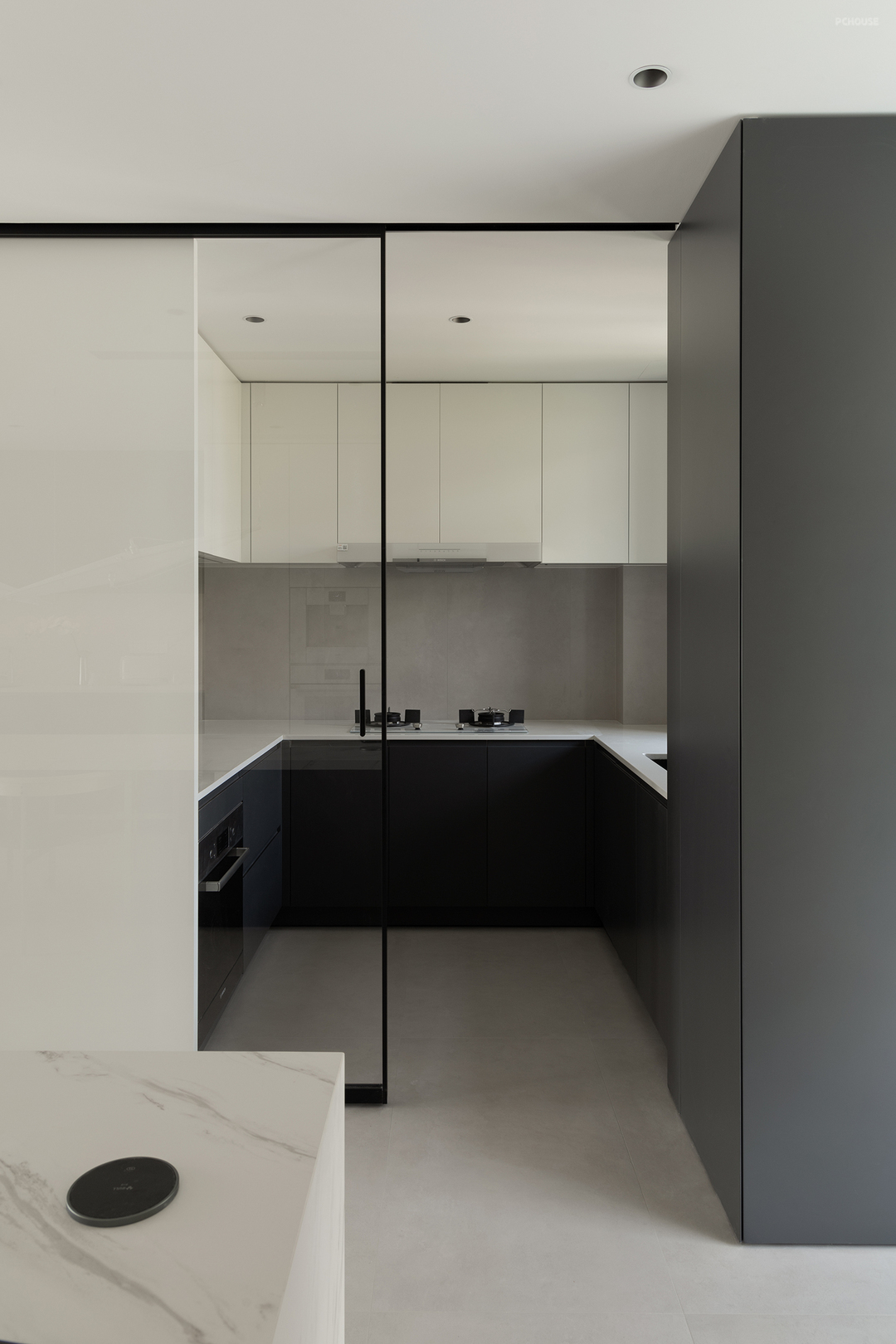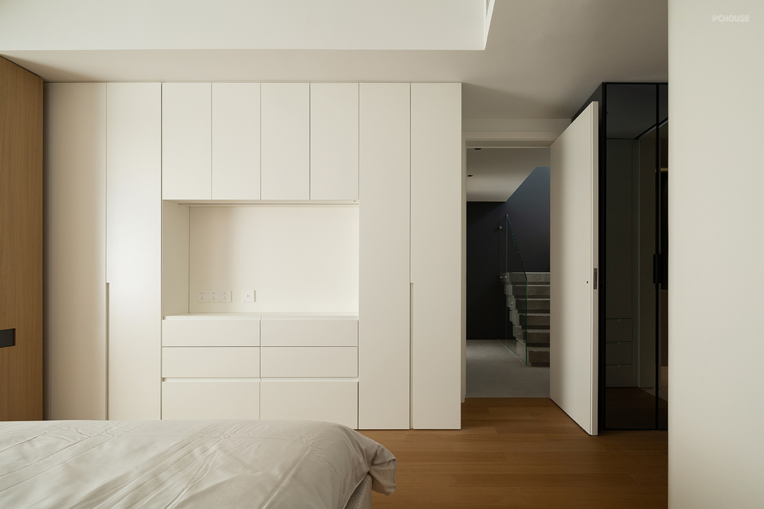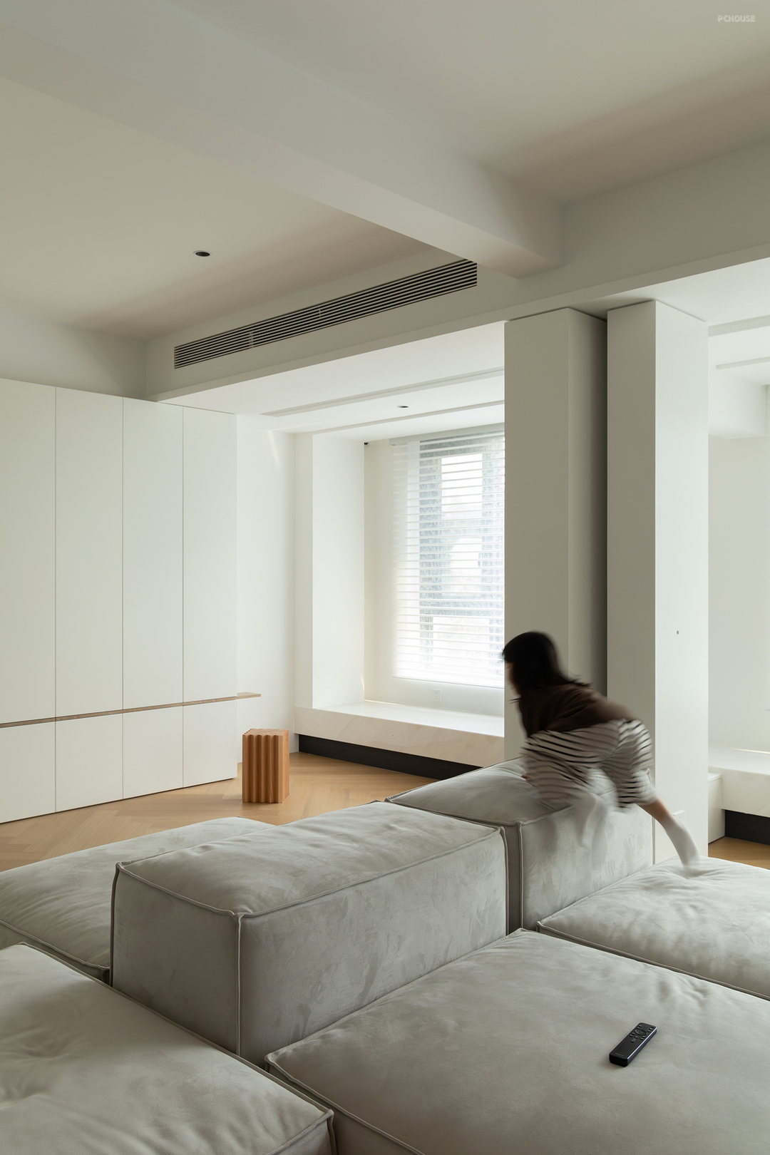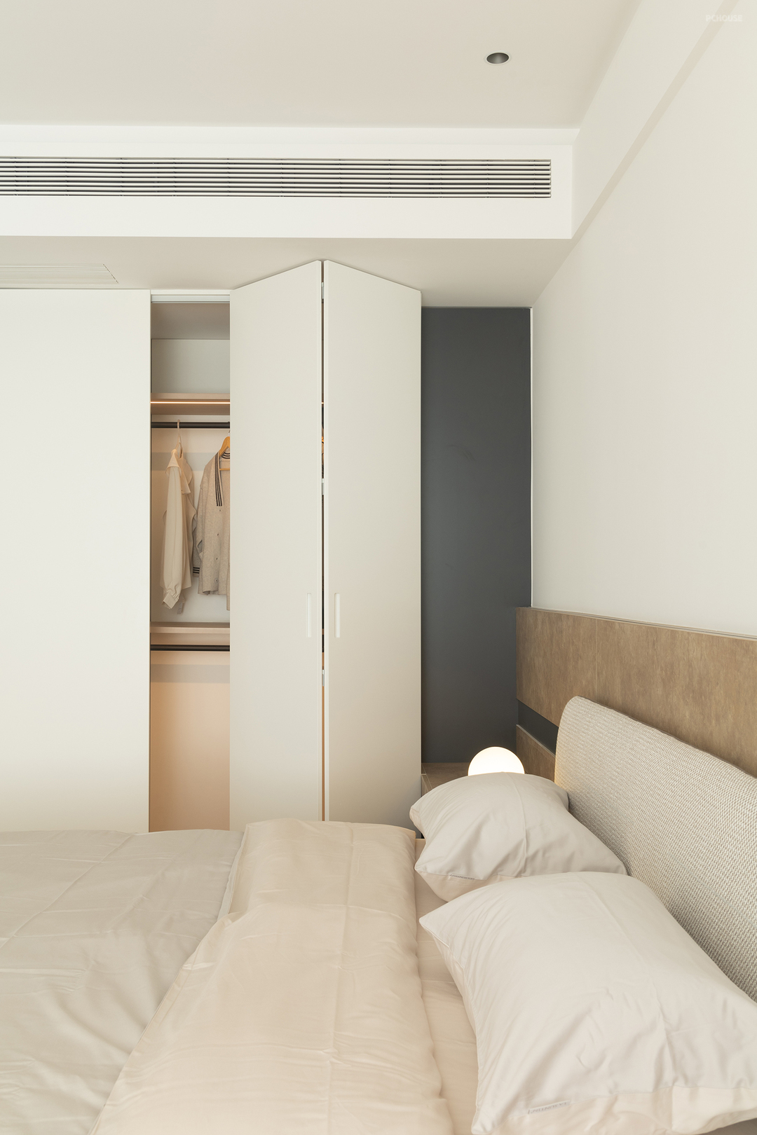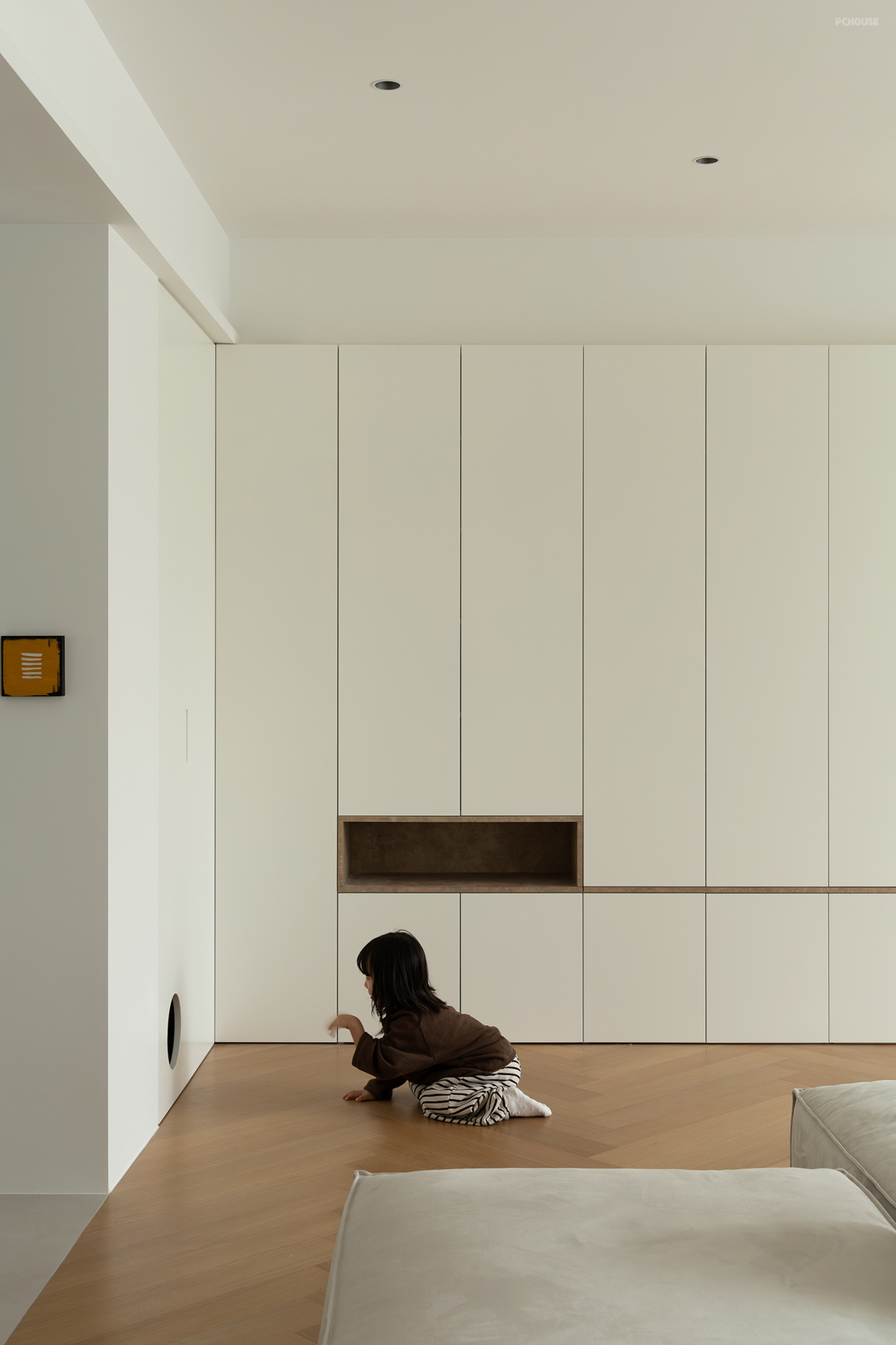 对原始空间布局方位调整,于是用柜体整合承重墙为一体,在满足储物收纳的同时也使空间的构造开阔性更大。