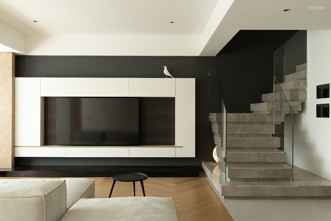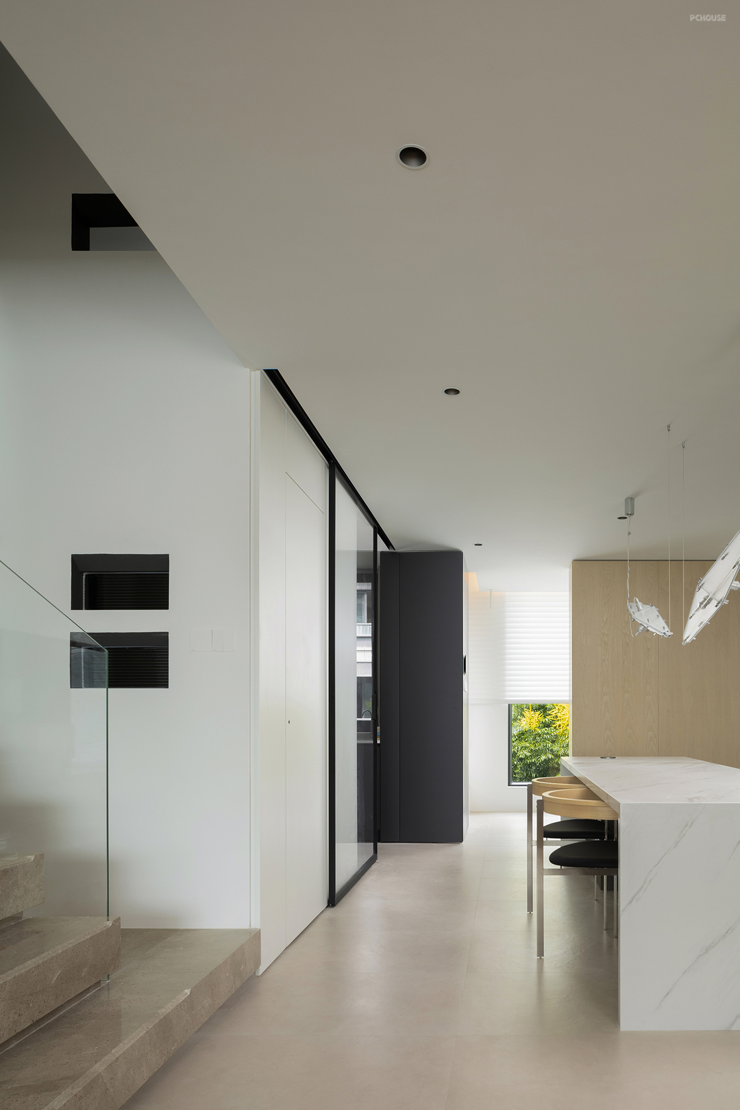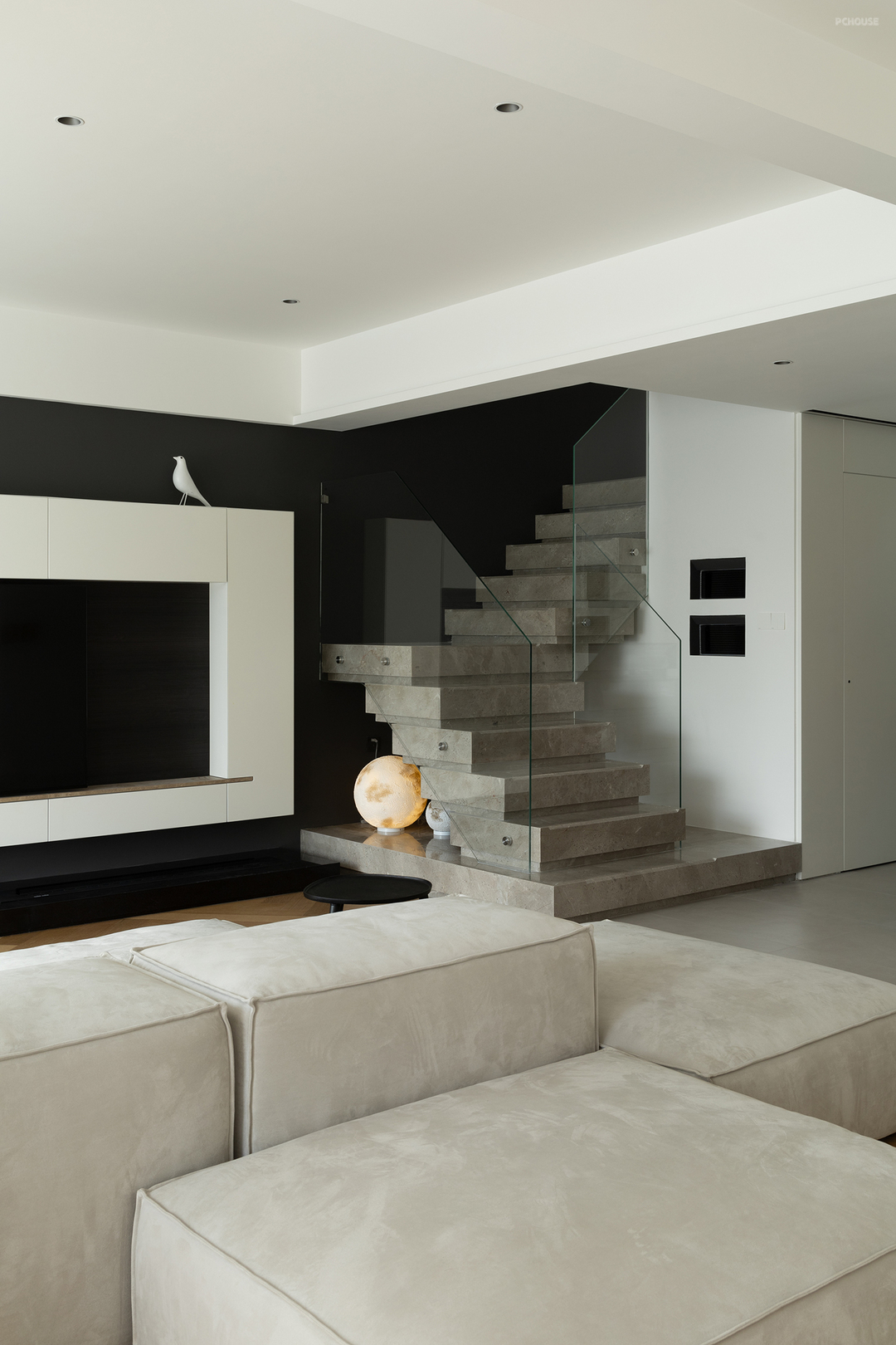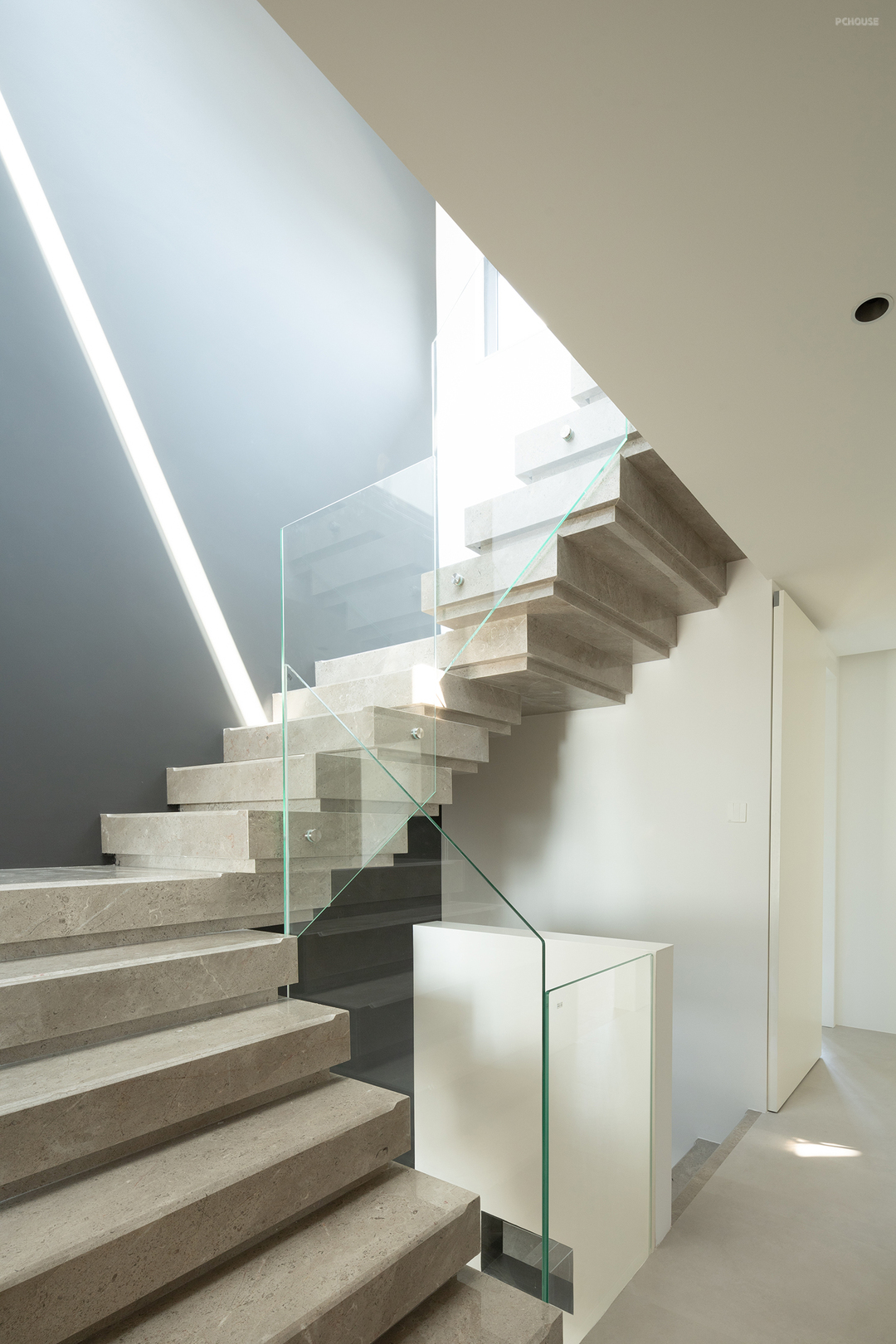 楼梯将功能和艺术兼并,将空间的美妙层次描绘得淋漓尽致。光线穿透其间,以最细腻的方式潜游在空间深处,空灵且悠长。