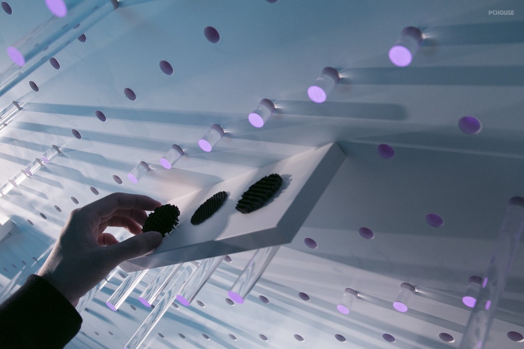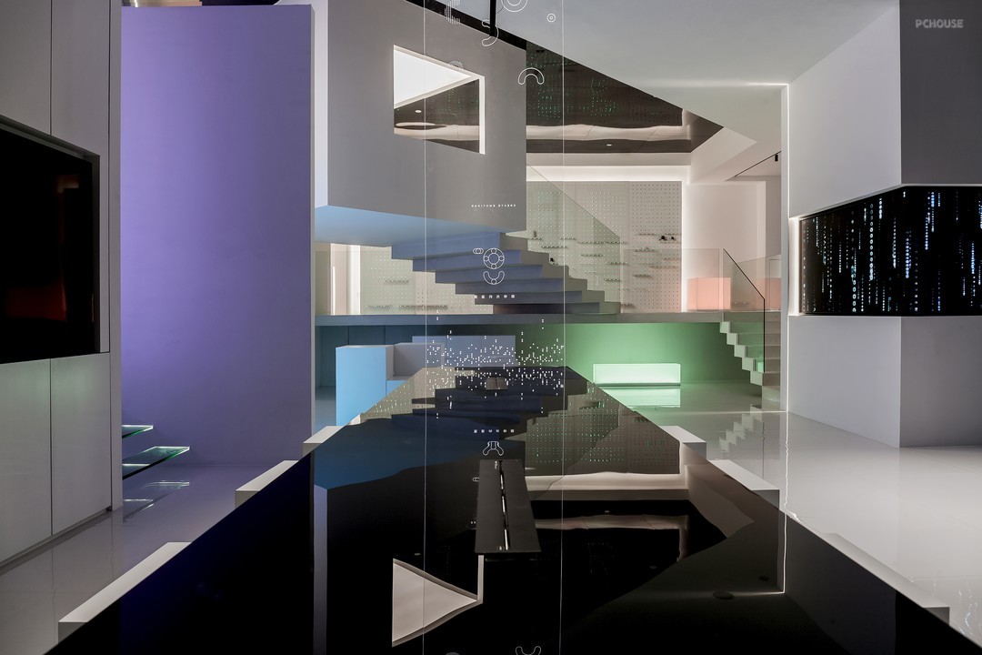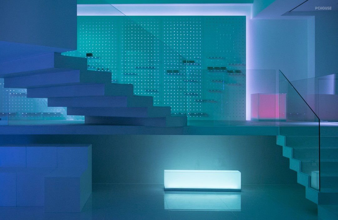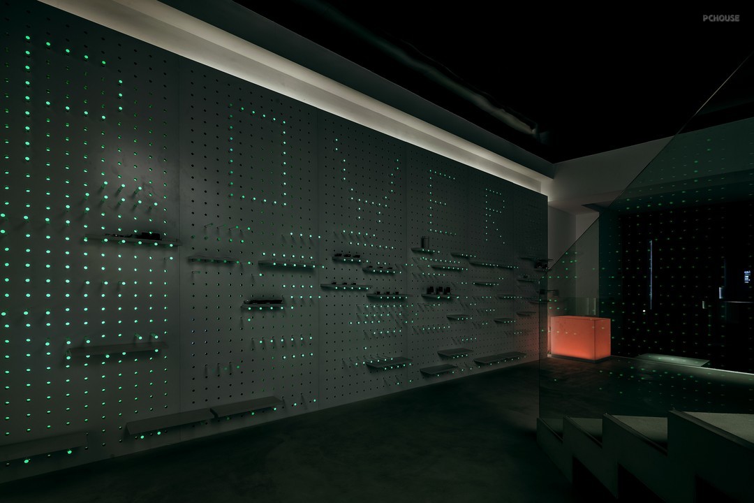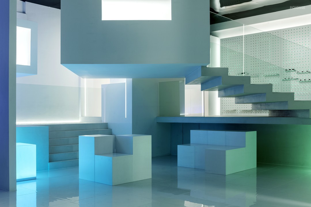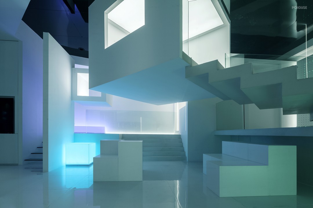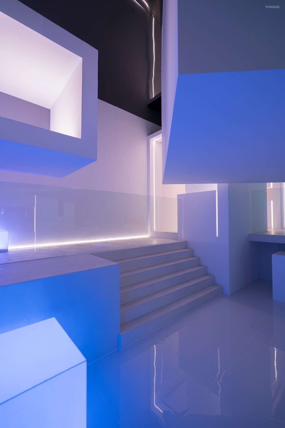 室内使用几何体块构建,打造出纯粹的光影空间。舍弃了装饰性的元素和标示性的设计,让人少了既定思维,模糊了空间的界限。不同尺寸的方形体块分布在展厅的各个区域,创造出不同的空间比例,通过光照渲染形成漂浮错落的失重错觉。漂浮平台上布置了展示冲孔板,光线从孔洞中的亚克力棒传射出来,借由颜色明暗的变化形成波动起伏的点状律动。