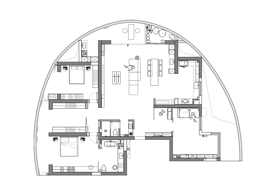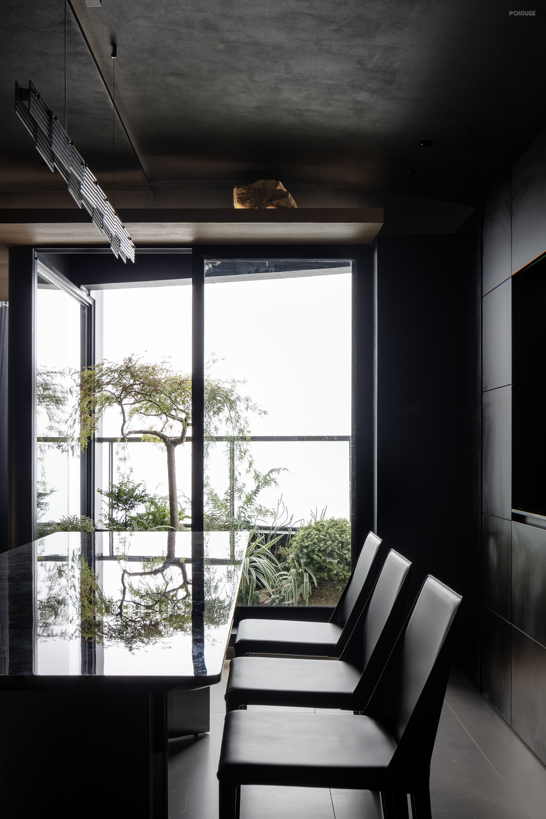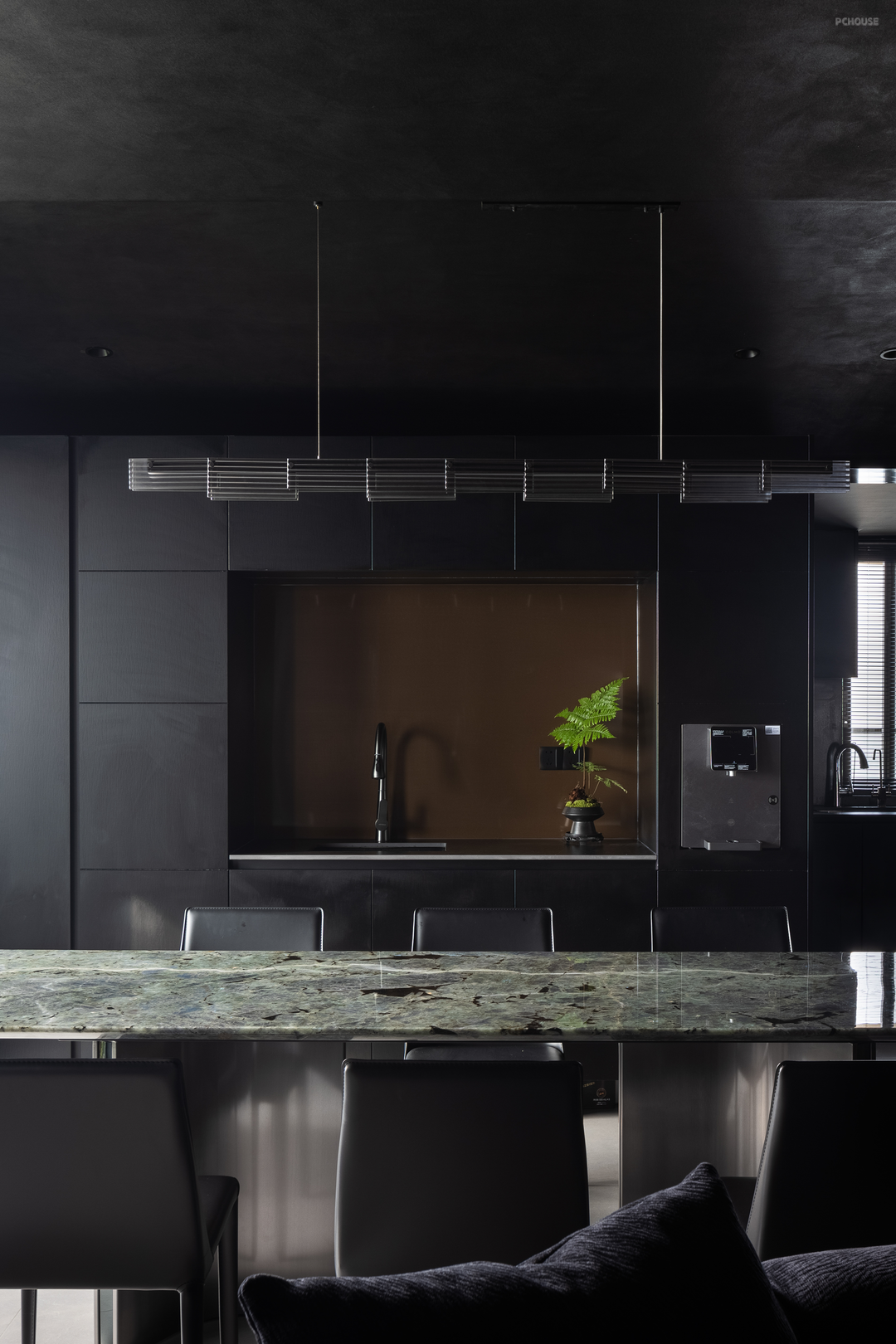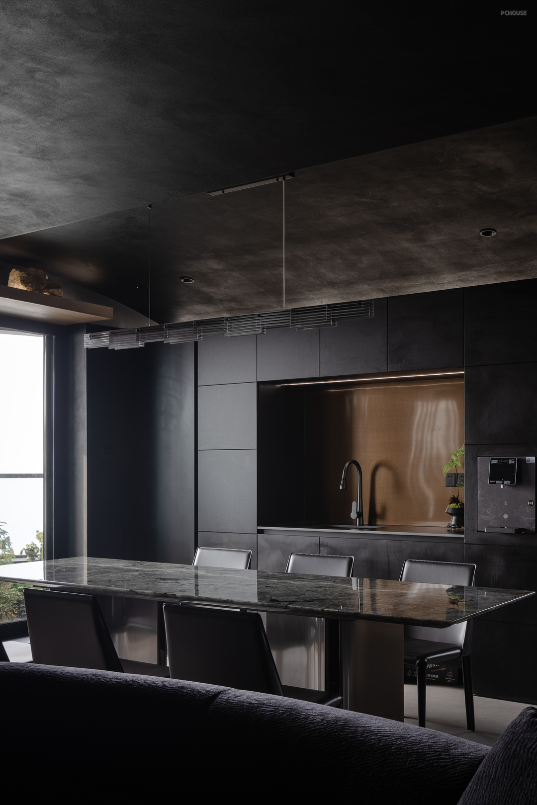 炭黑色吊顶延伸至餐厅一侧,在餐边柜上方缓缓垂落,为空间增添温柔涌动的戏剧感,烘托餐厅的独特氛围,为日常三餐或亲朋聚餐带来仪式感。