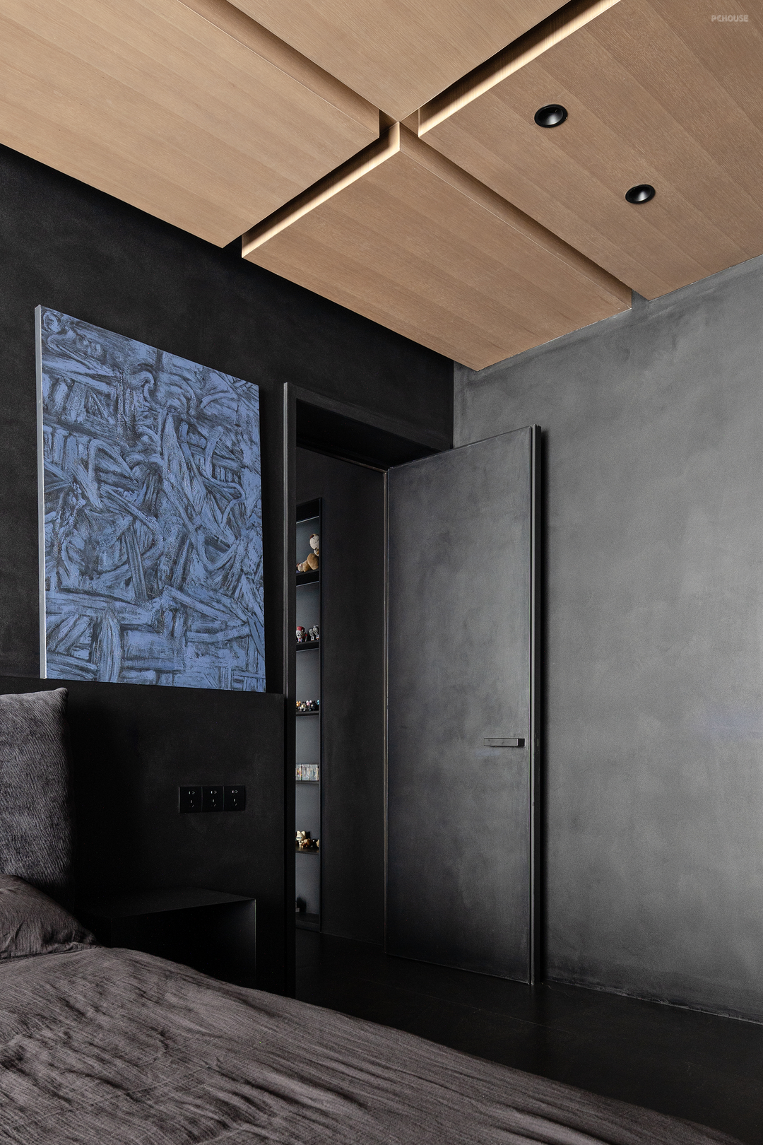 将主卧旁的次卧并入,改为衣帽间,一面做顶天立地的封闭柜体储物,一面用模块化开放架,开放架背景表面做仿金属的特殊肌理,顶面则用镜面不锈钢,利用反射拉高空间视觉效果。