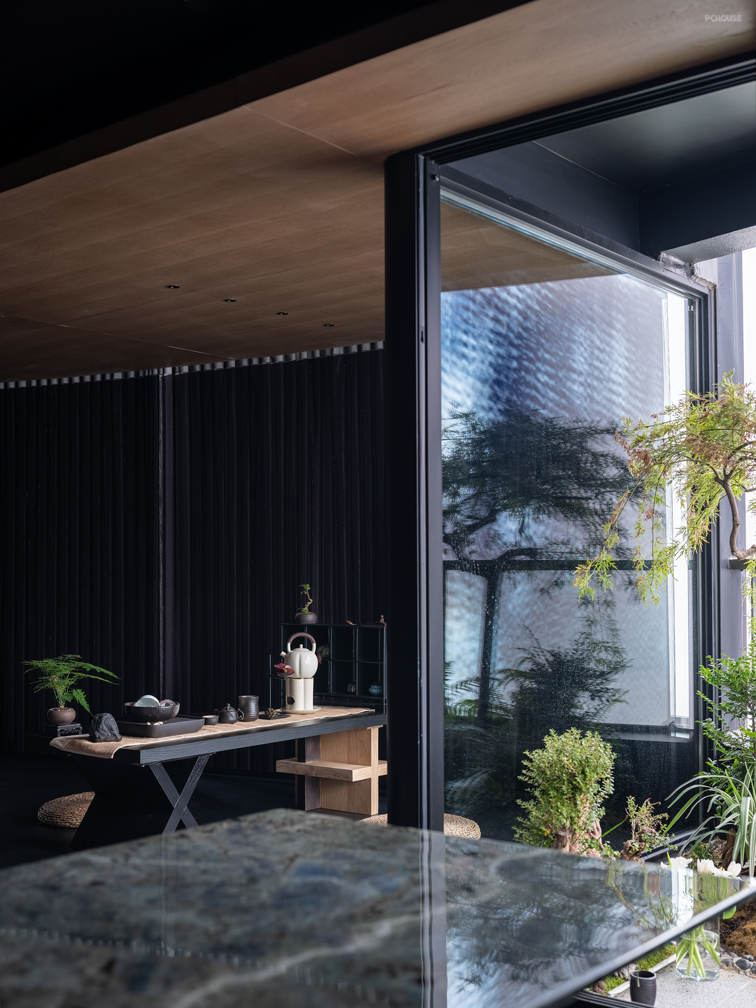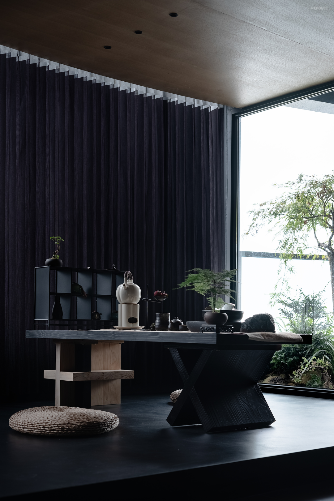 封闭的部分抬高,做成开放的茶室,蒲团矮几,沉香小炉,是屋主放松休闲之处。