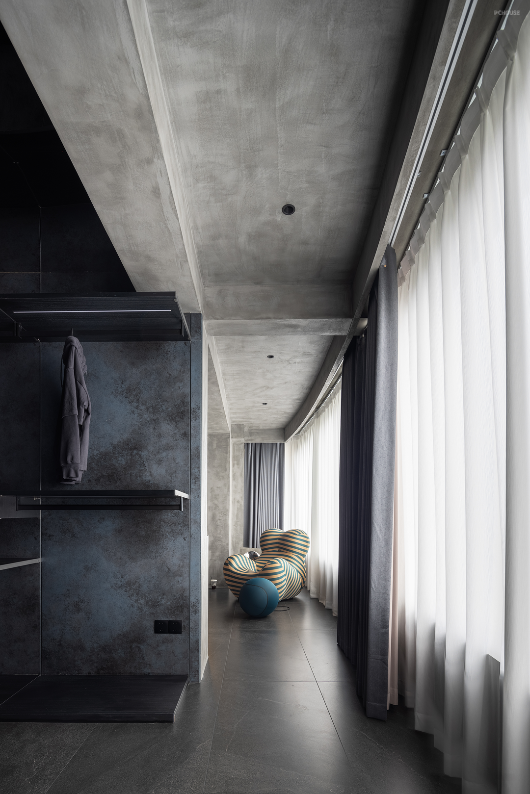 仿旧的,带来粗粝感的金属元素恰好与过道裸露的梁体相称,过道原为两间卧室各自独立的阳台,我们将它打通,表面使用仿水泥的艺术漆,突出空间的结构。