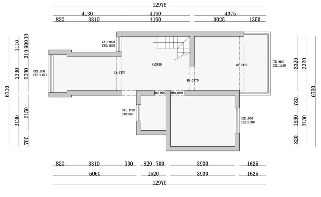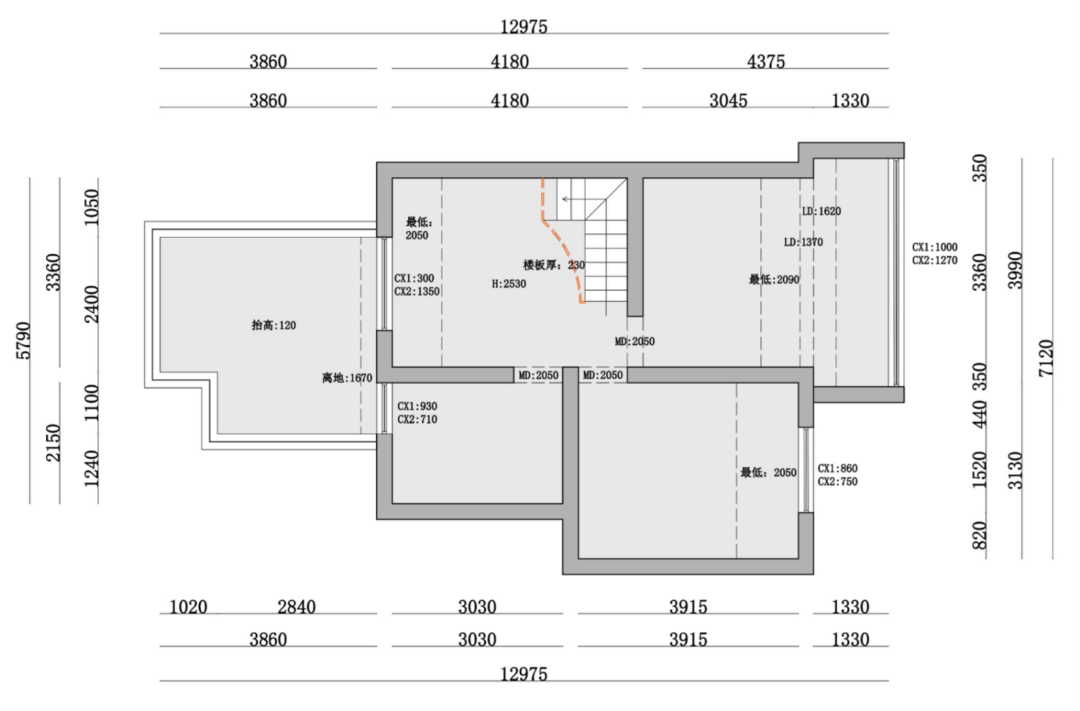 4.二层卫生间空间占比偏大,公区空间狭小且采光不佳。