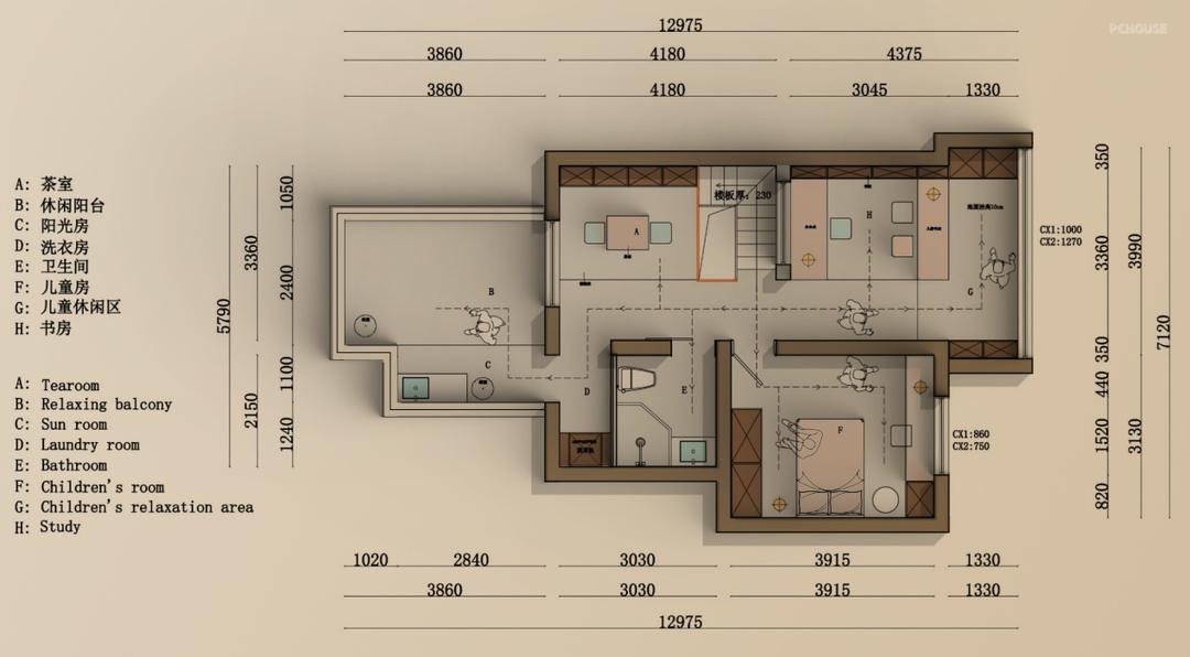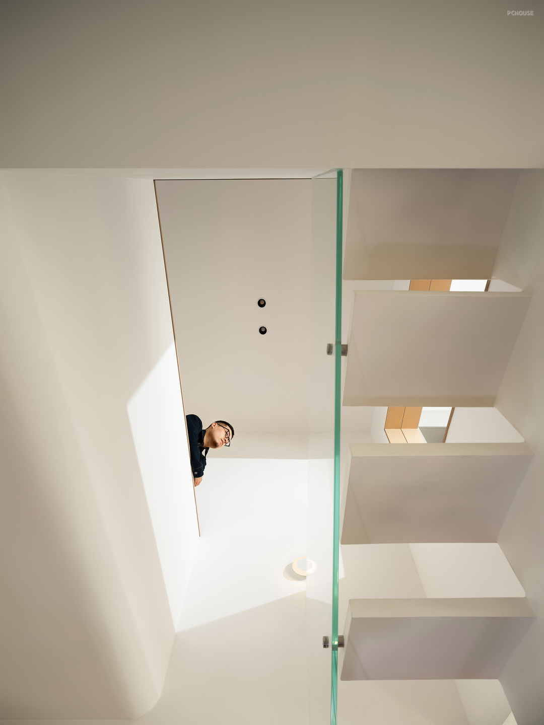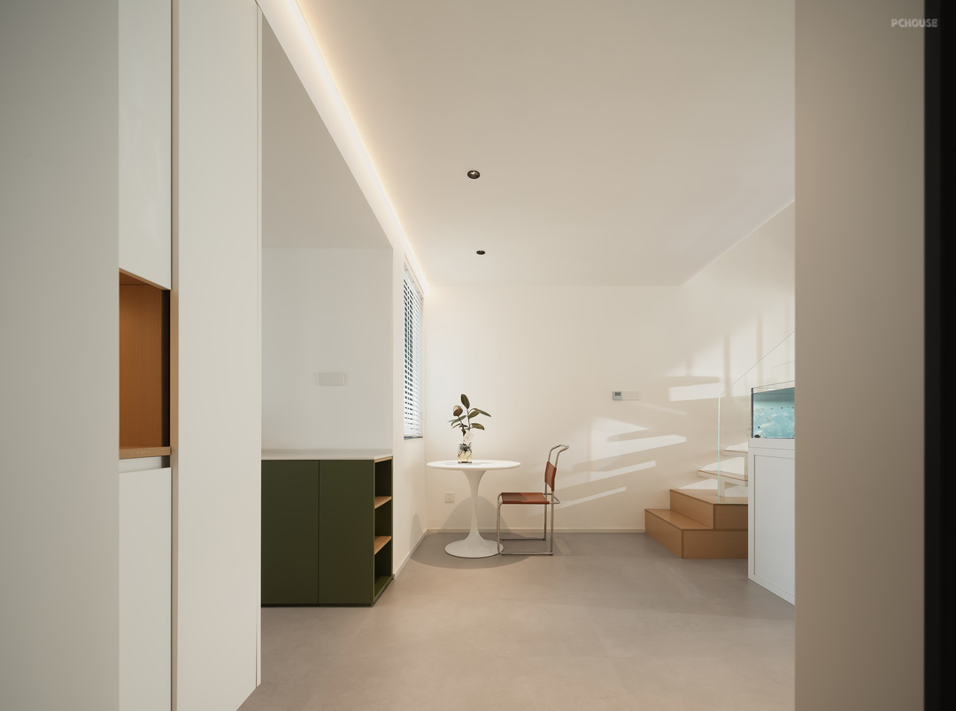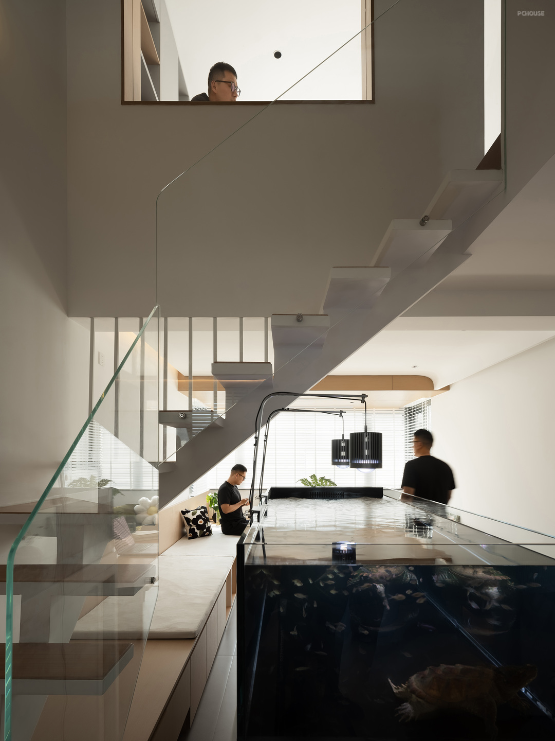 2:楼梯北侧作为屋主的茶空间,我们将靠近扶手的地面局部抬高,使其与过道地面形成一个分界,强化了区域的划分,也让整个空间富有层次感。