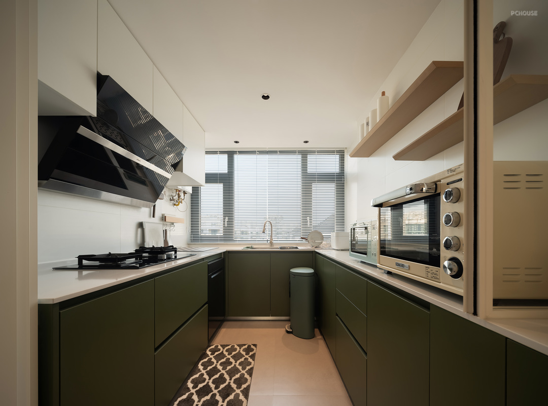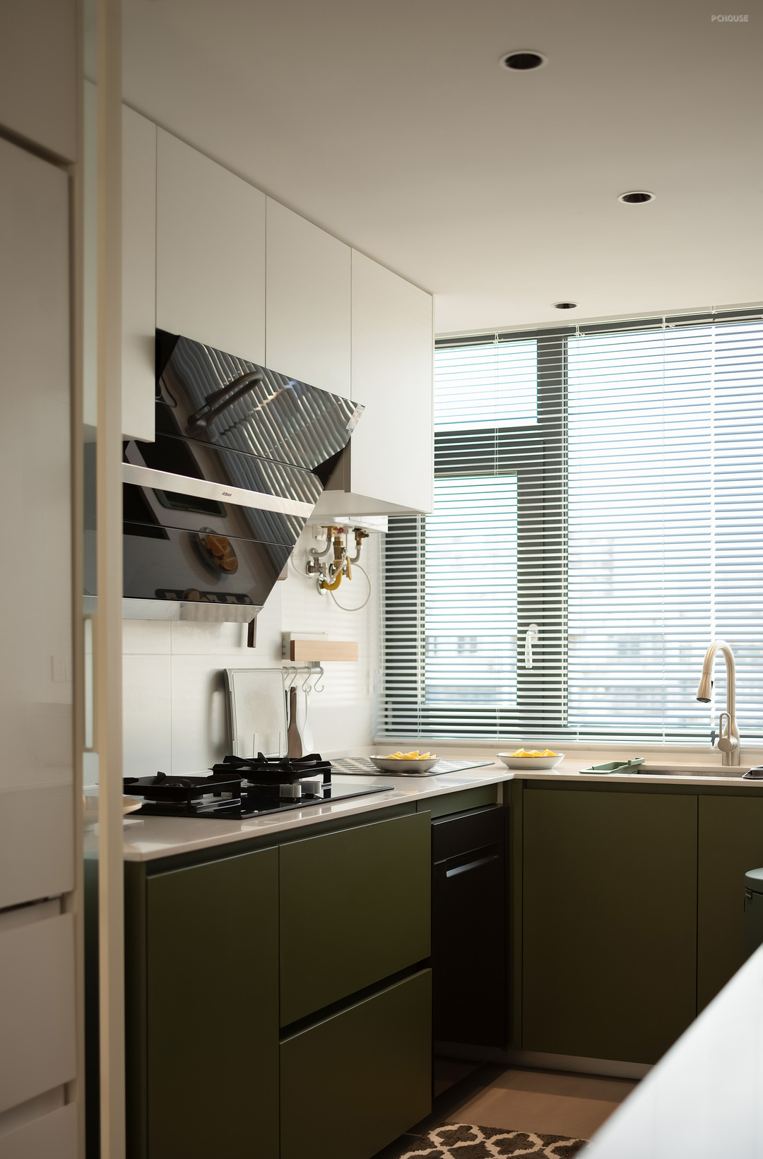 我们使用屋主喜爱的绿色地柜和白色吊柜,打造了一个清新欢快的厨房空间!墙面白色哑光面砖搭配白色石材台面,让整个厨房更加明亮清爽