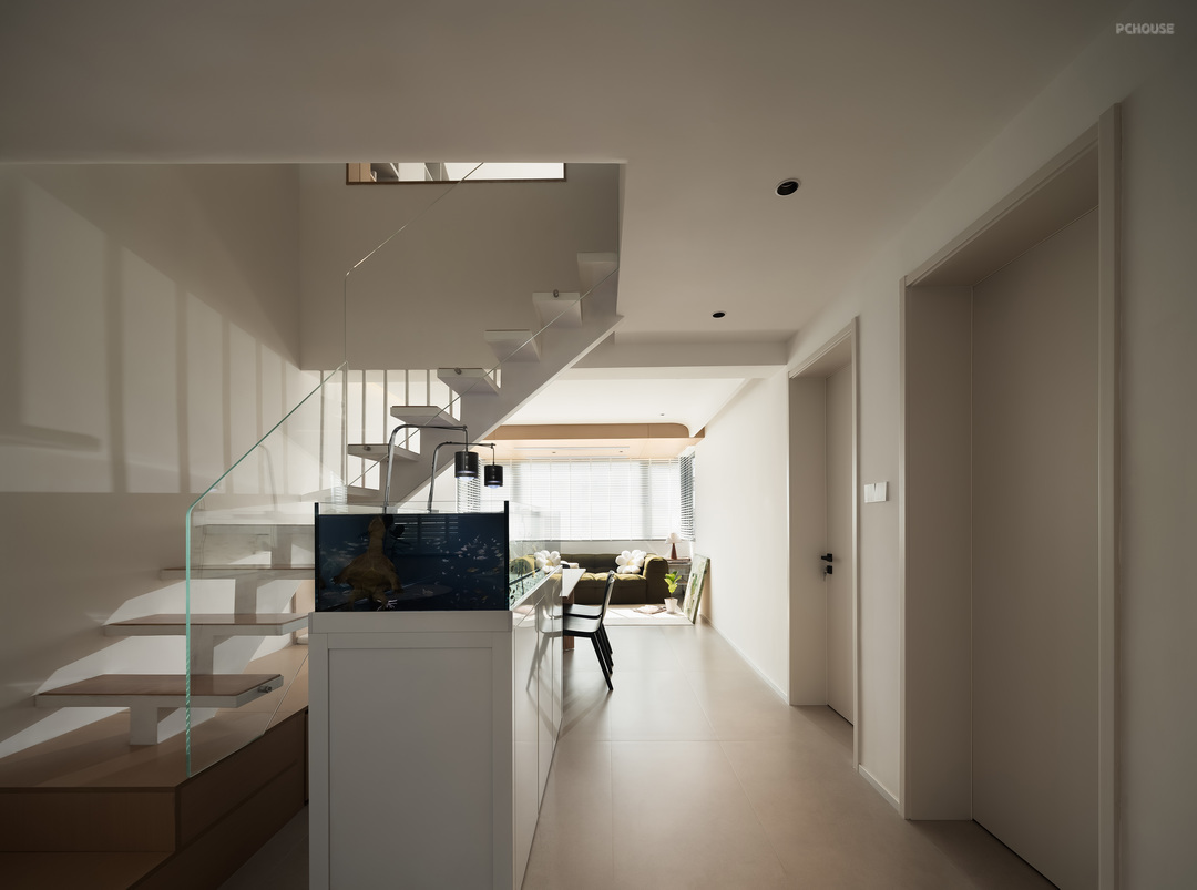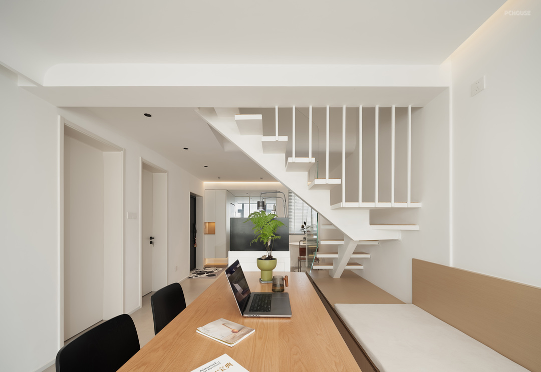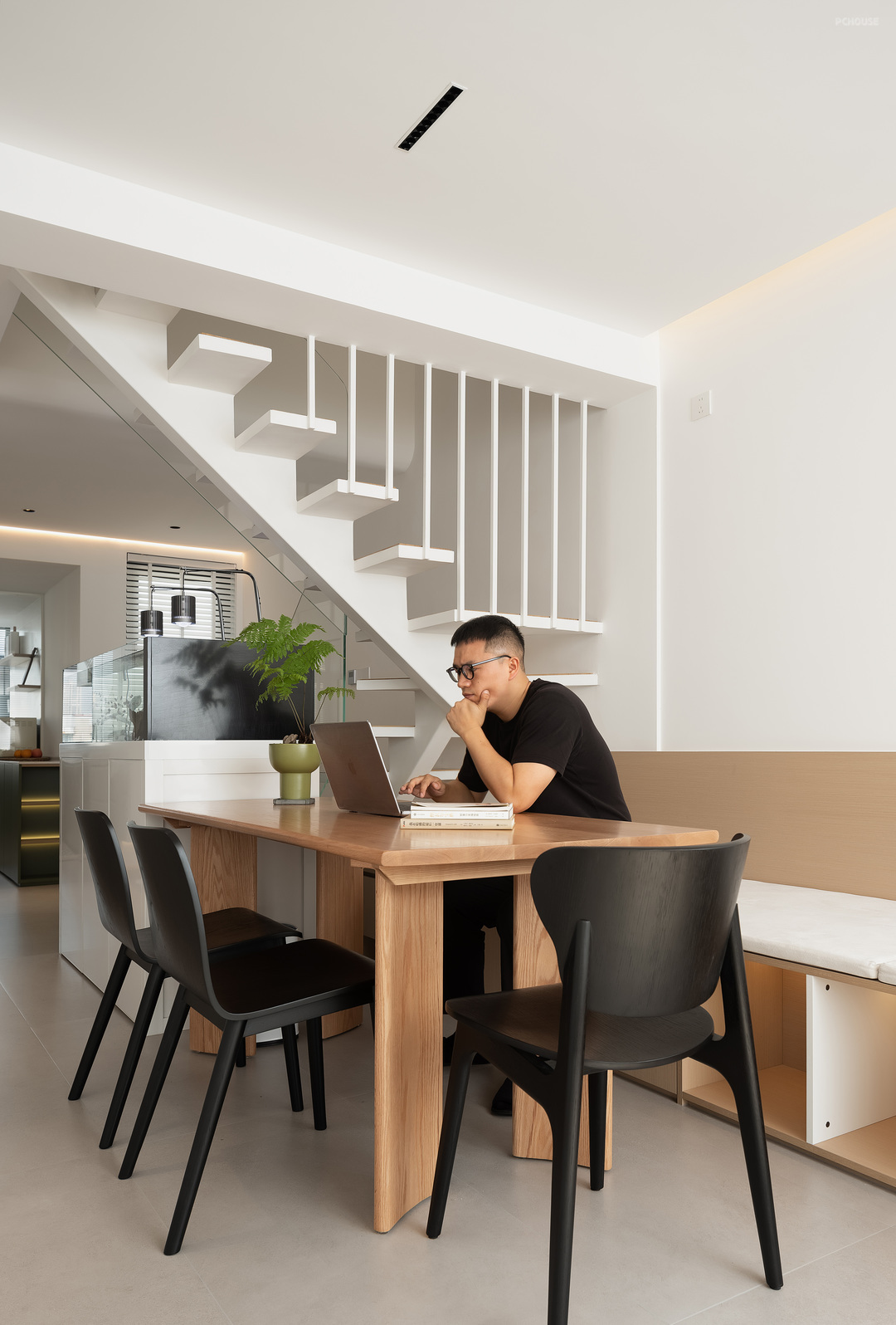 楼梯踏步延伸至餐厅空间作为餐凳使用,从而释放了更多的空间给过道。这样的设计不仅实用,还增添了点点小惊喜哦!